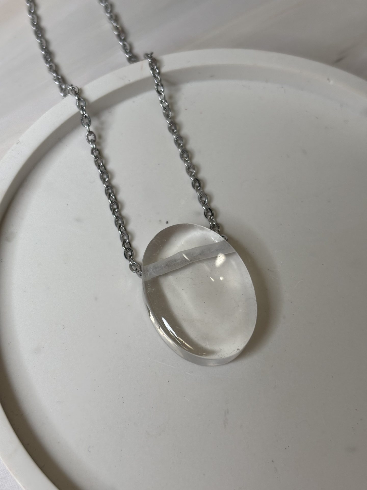 29,00€Collier cabochon en Cristal de Roche de qualité extra AAA monté sur chaîne en maille forçat réglable 45 cm en acier inoxydable argenté hypoallergénique fabriqué à la main dans notre atelier. Vendu à l’unité.
