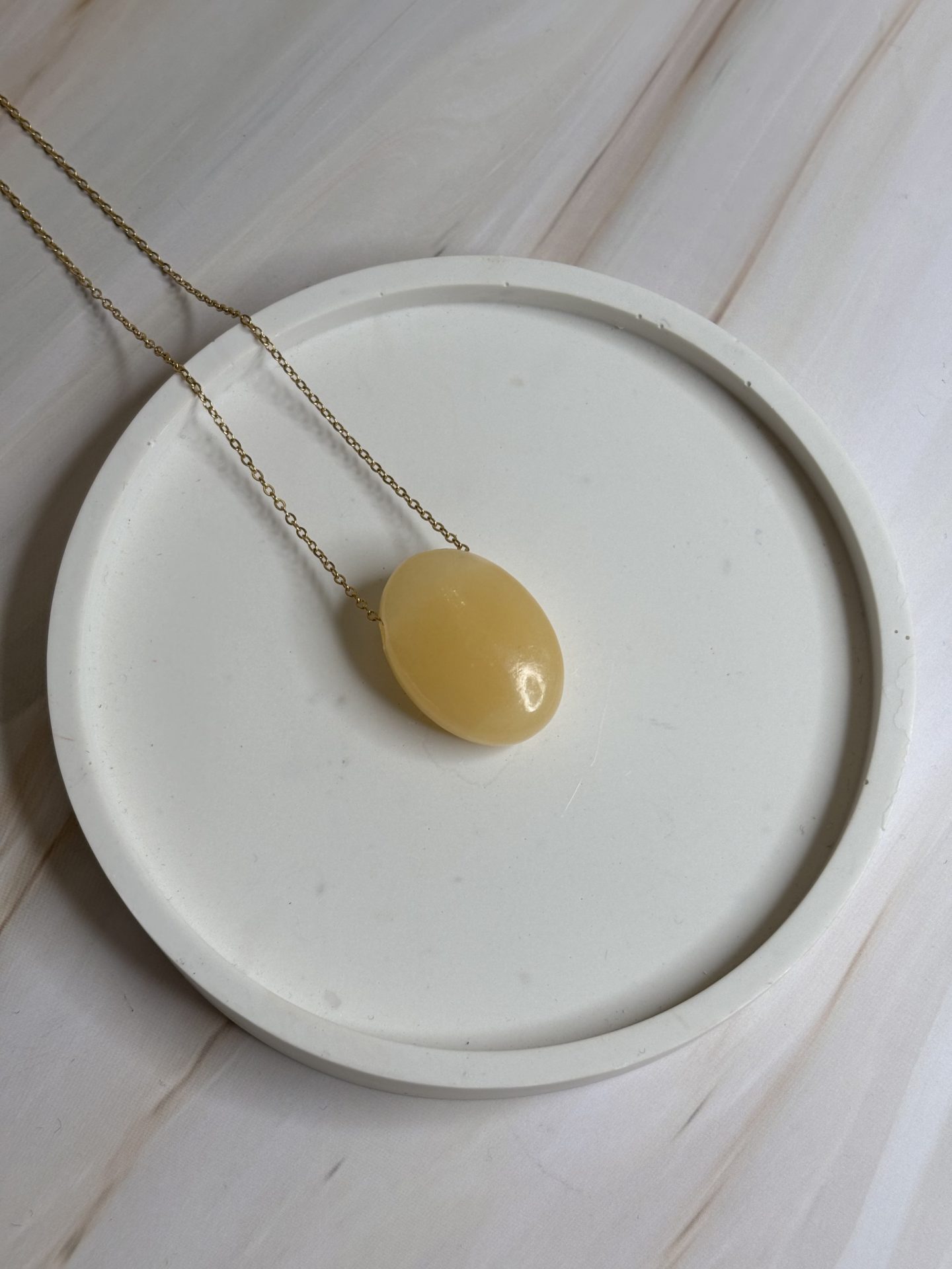 33,00€Collier artisanal en Fluorite Jaune naturelle, cabochon poli posé sur chaîne maille forçat en acier inoxydable doré (45 cm + rallonge) avec pampille “Les Petits Glow”.