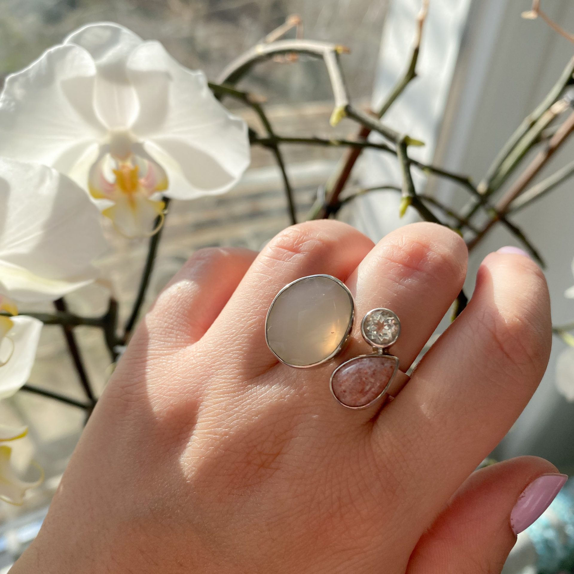 Bague sertie d’une Pierre de Lune facettée, d’une Pierre de Soleil en forme de goutte et d’une Topaze Blanche. Montées sur de l’argent massif 925.