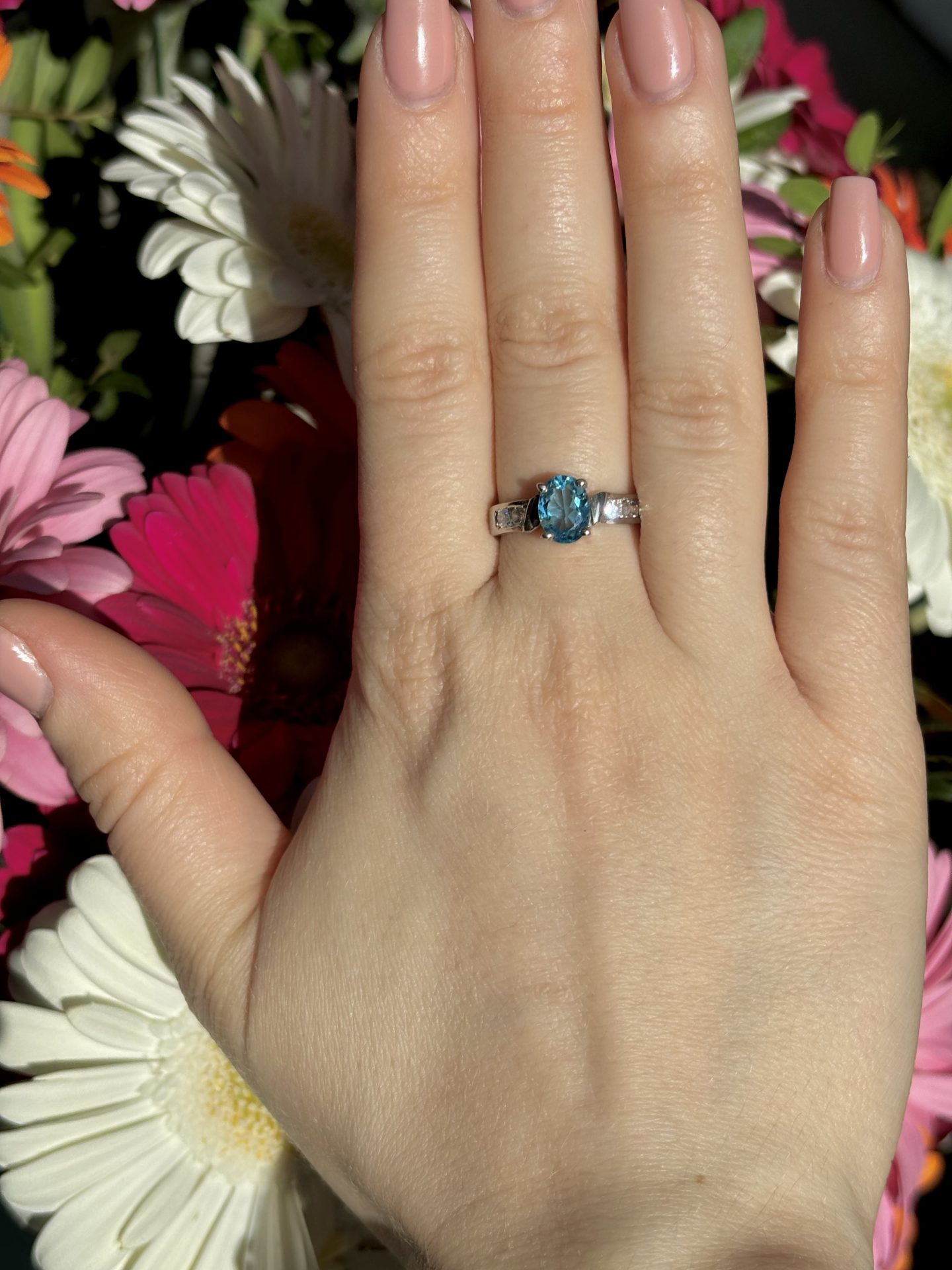 Bague solitaire ovale sertie d’une Topaze bleue facettée avec 4 cristaux de quartz facettés sur le côté. Argent massif 925. Taille 54.