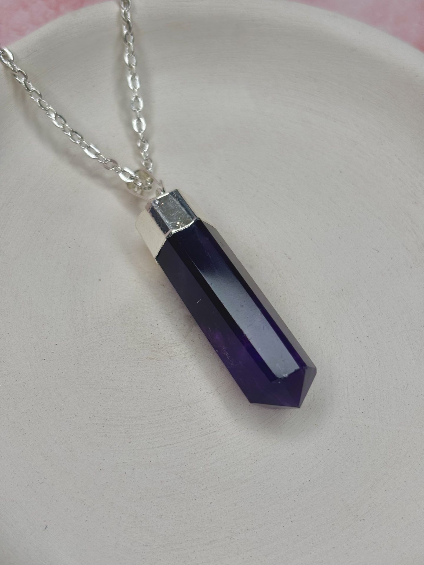 Pendentif Pointe en Améthyste monté sur chaîne en maille forçat 45 cm avec rallonge en acier inoxydable argenté et pampille « Les Petits Glow ». Fabriqué à la main dans notre atelier. Vendu à l’unité.