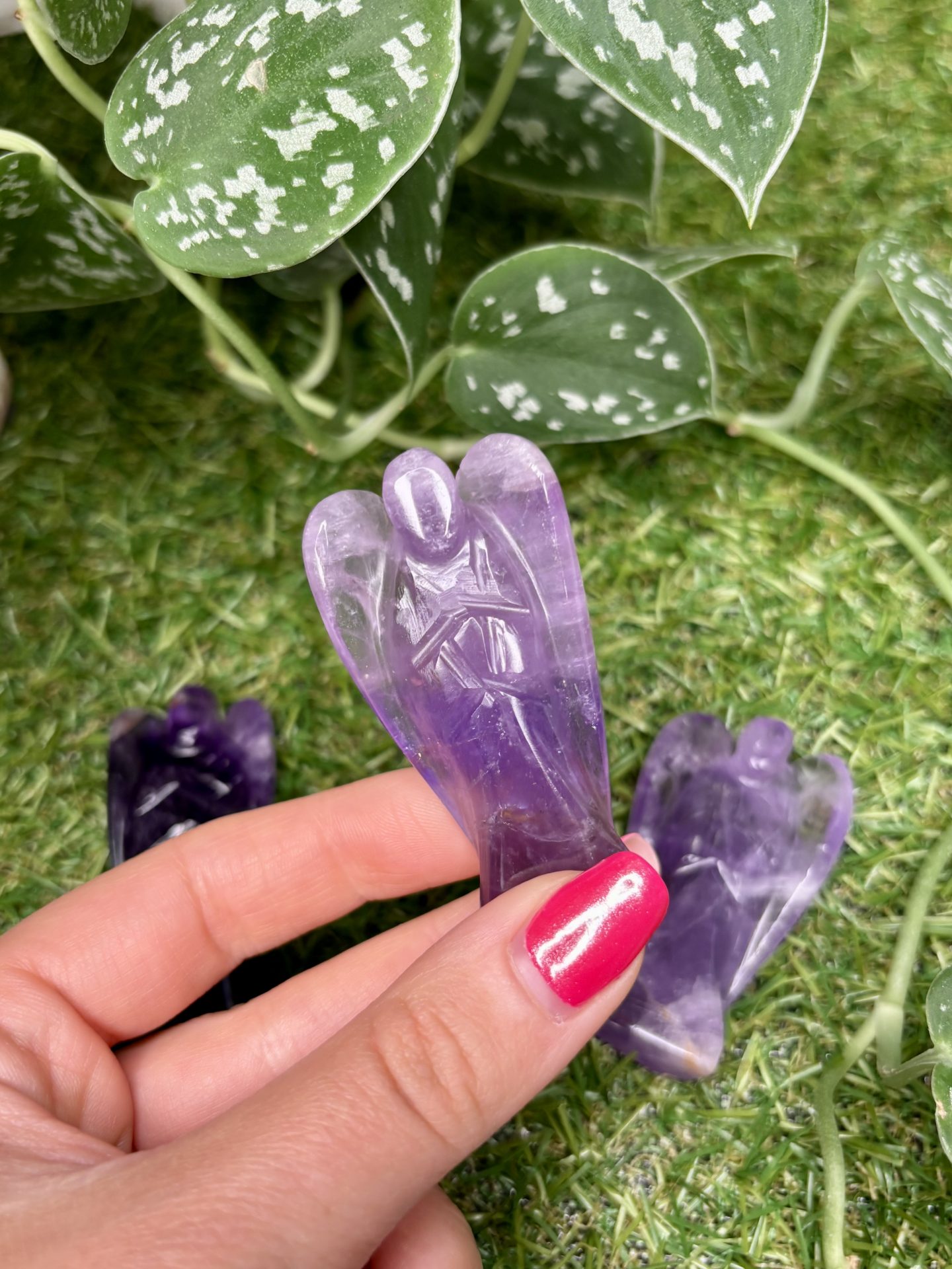 Sa petite taille (5 cm) est idéale pour vous permettre de l’avoir toujours sur vous, dans votre poche ou votre sac à main, pour profiter de ses bienfaits tout au long de la journée ✨. Ce magnifique petit ange est taillé à la main avec grande finesse et précision dans de l’Améthyste de qualité extra 🤍