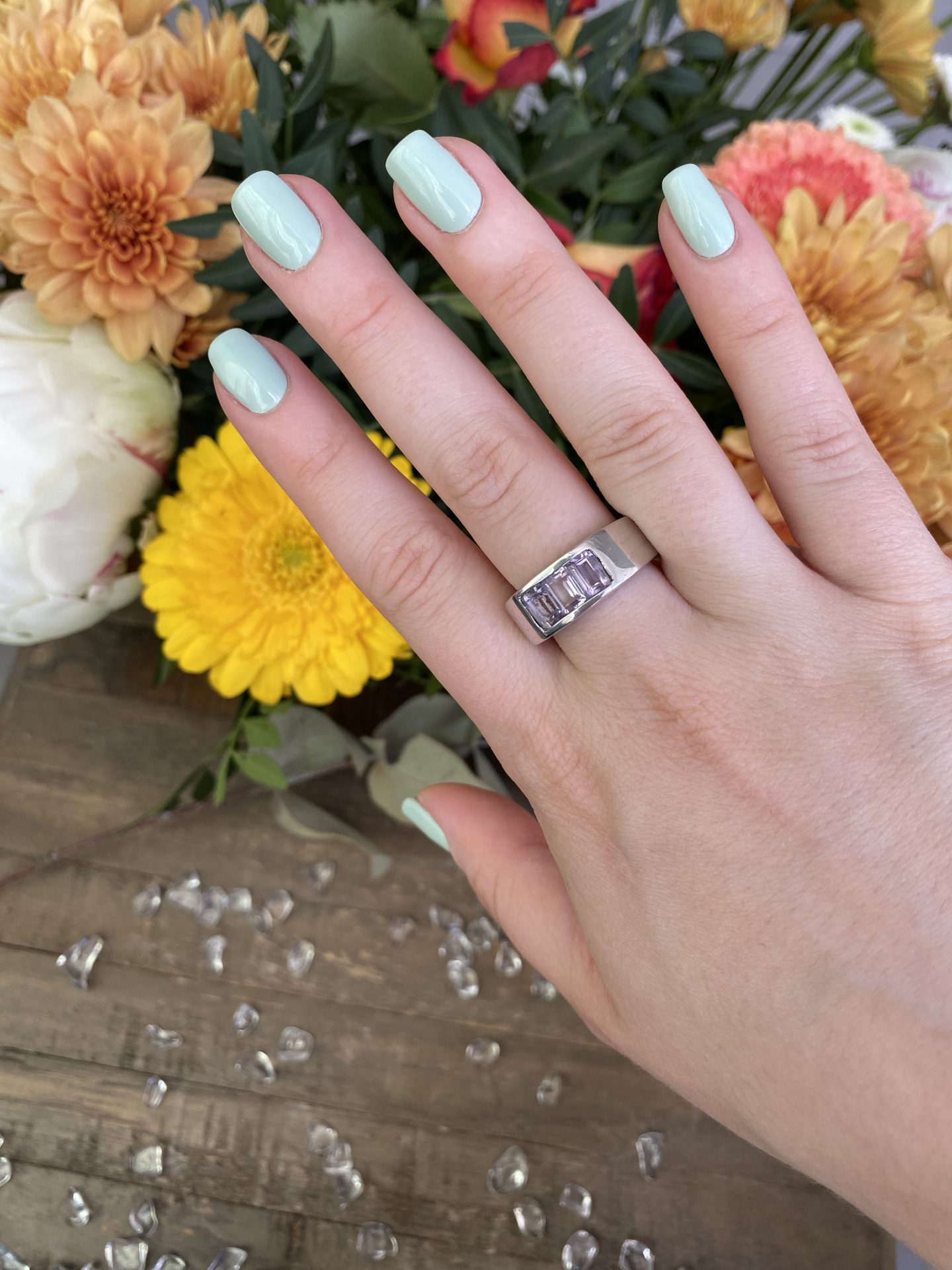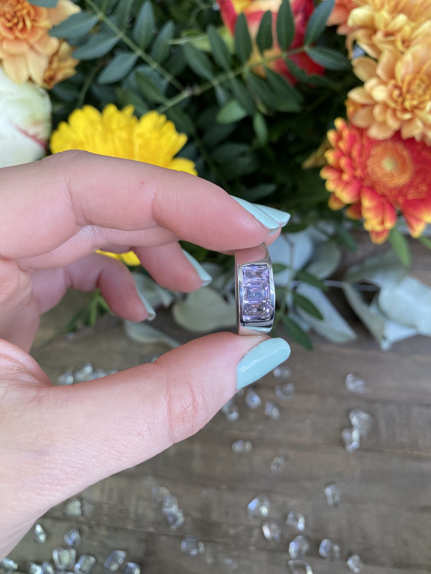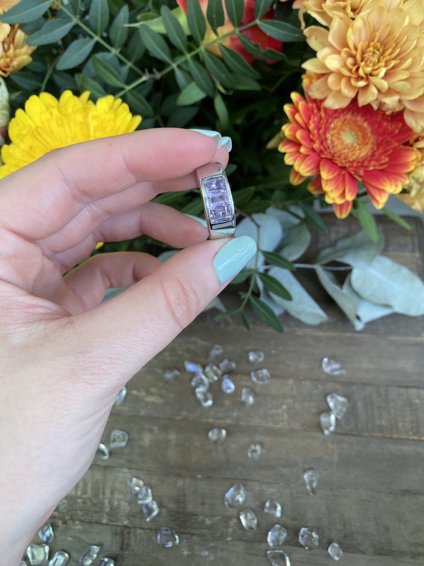 Anneau serti de 3 Améthystes facettées, taillées en émeraude. Montées sur de l’argent massif 925.