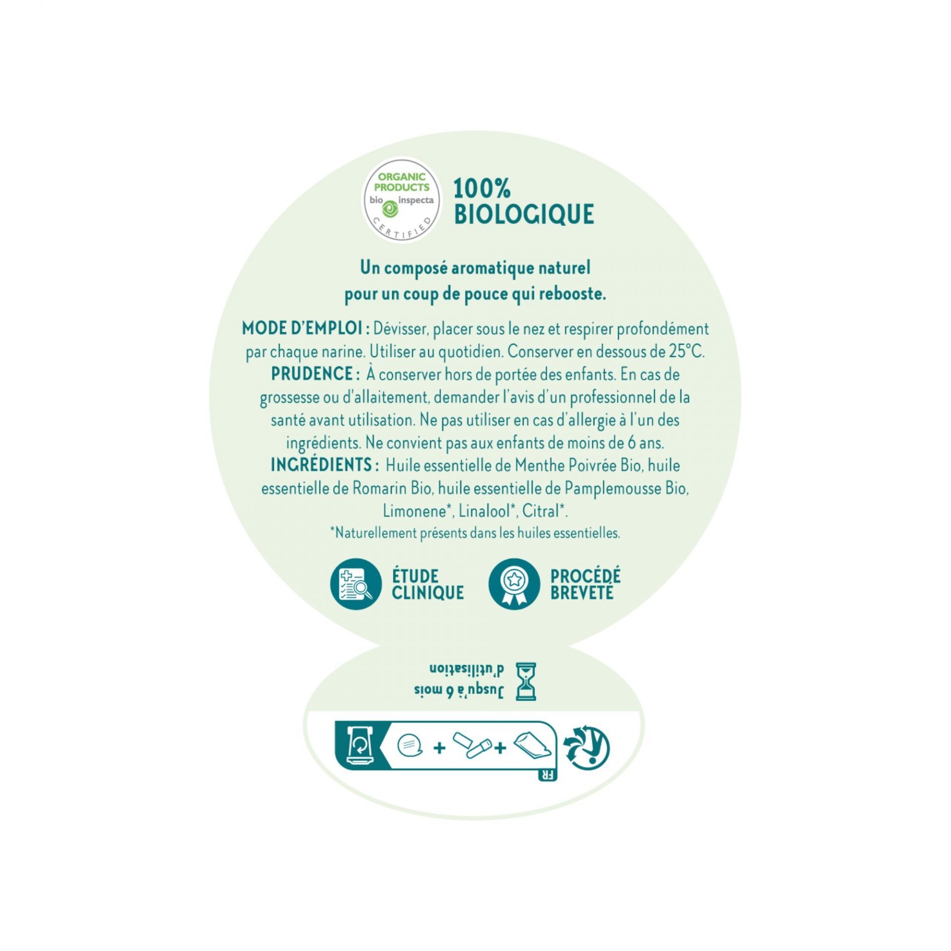 Huile essentielle de Menthe Poivrée Bio, huile essentielle de Romarin Bio, huile essentielle de Pamplemousse Bio, Limonene*, Linalool*, Citral*. *Naturellement présents dans les huiles essentielles.