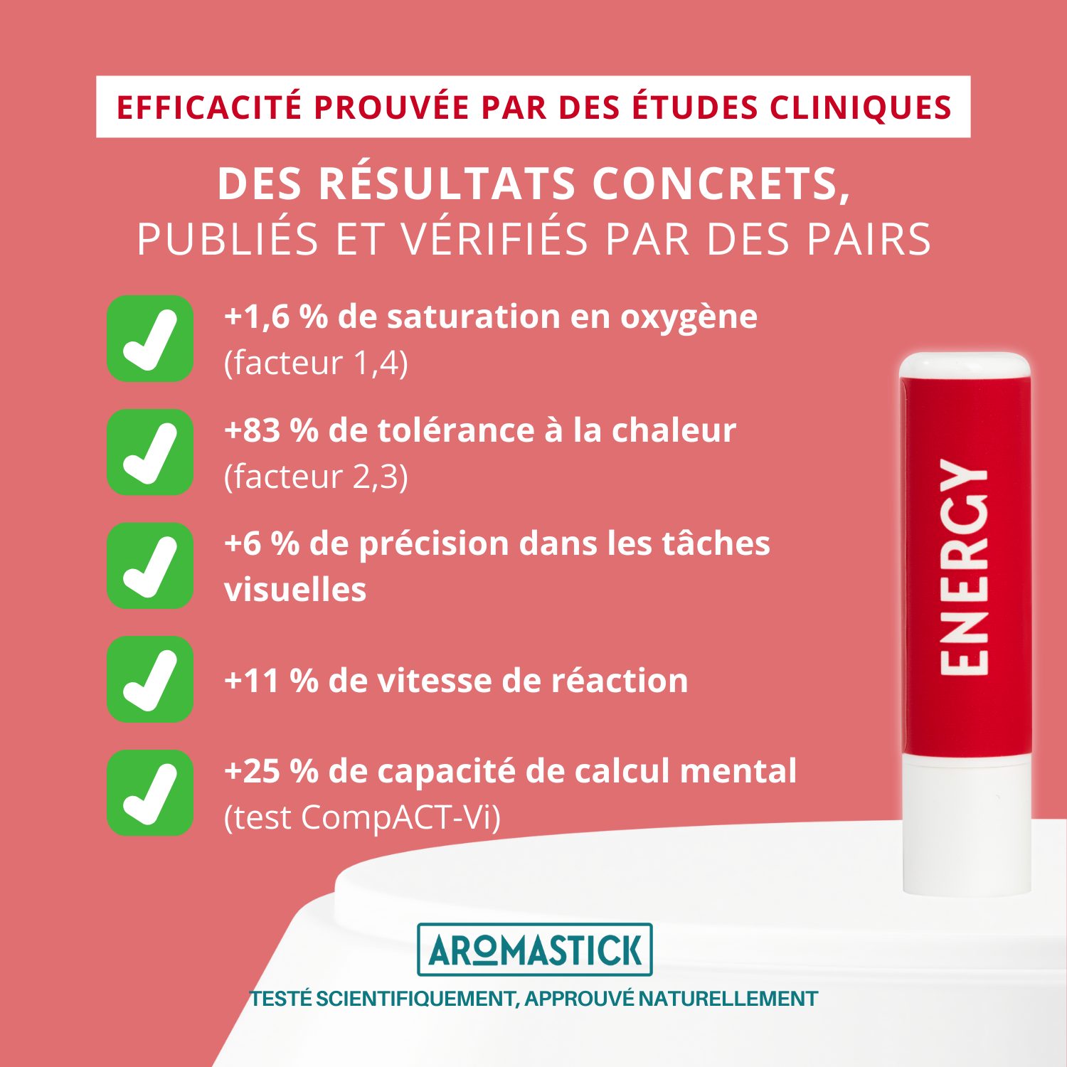 Des publications scientifiques démontrent que le mélange unique de l’Aromastick ENERGY améliore l’absorption d’oxygène ainsi que les performances physiques et cognitives. Des recherches démontrent également que l’Aromastick ENERGY améliore la concentration et la vitesse de traitement de l’information tout en diminuant le nombre d’erreurs.
