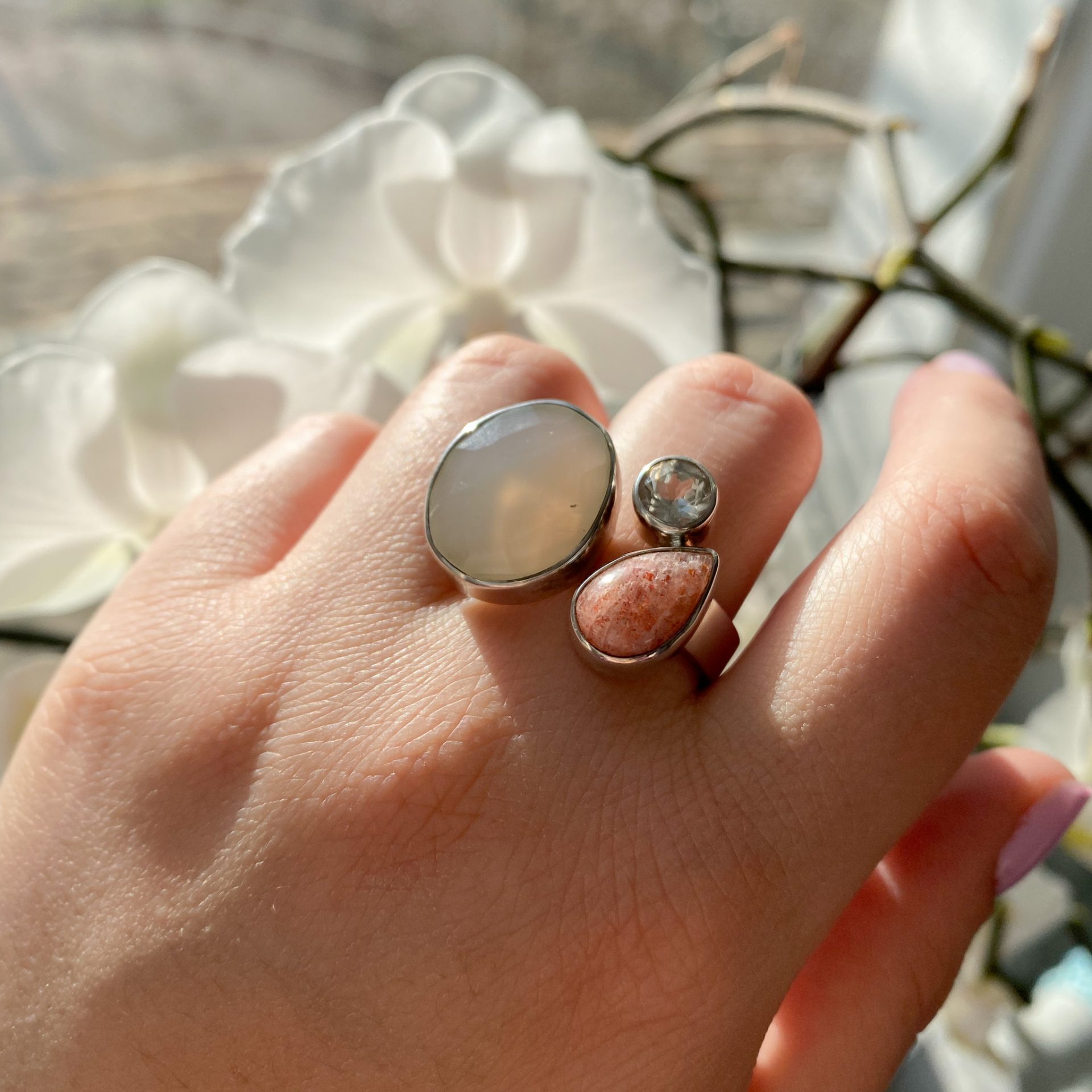 Bague sertie d’une Pierre de Lune facettée, d’une Pierre de Soleil en forme de goutte et d’une Topaze Blanche. Montées sur de l’argent massif 925.