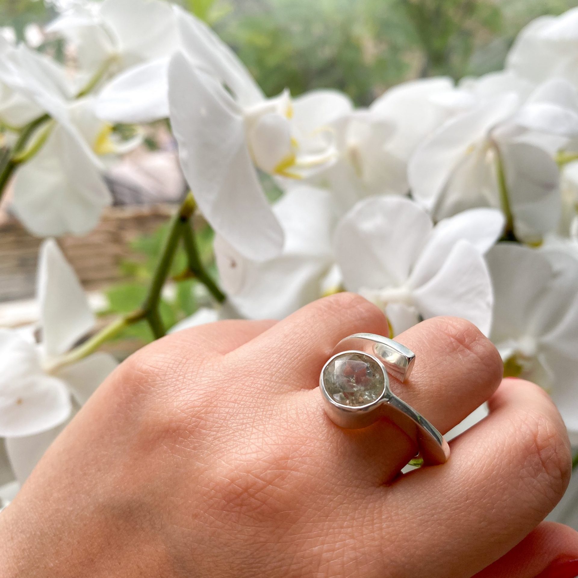Bague sertie d’une Prasiolite (Quartz Vert). Montée sur un anneau ouvert en argent massif 925.