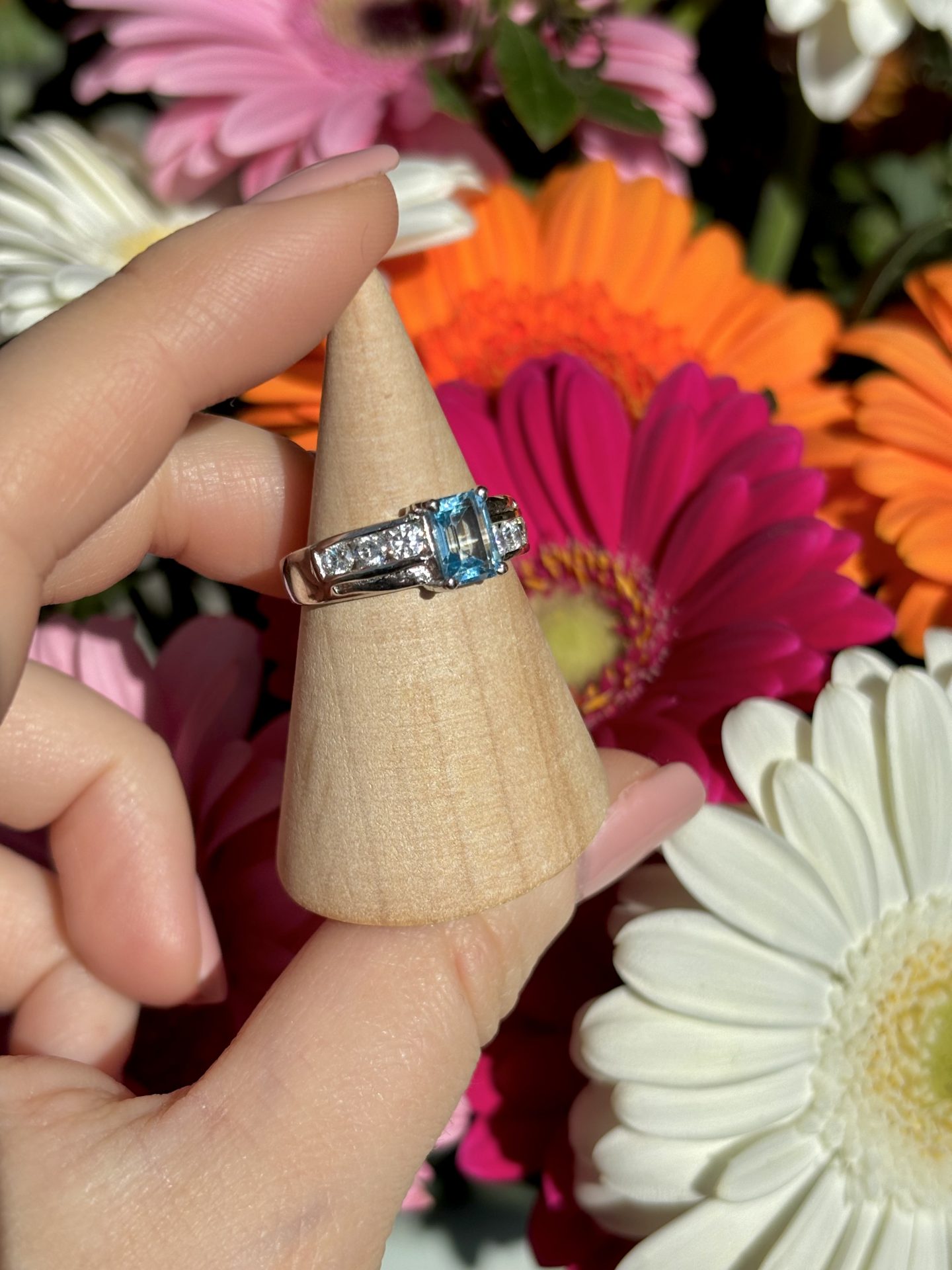 Solitaire serti d’une Topaze bleue facettée et taillée en Baguette, montée sur un anneau en argent 925 et délicatement entourée de six cristaux de quartz cristallins, eux aussi facettés pour capter chaque rayon de lumière. Argent massif 925. Taille 55.