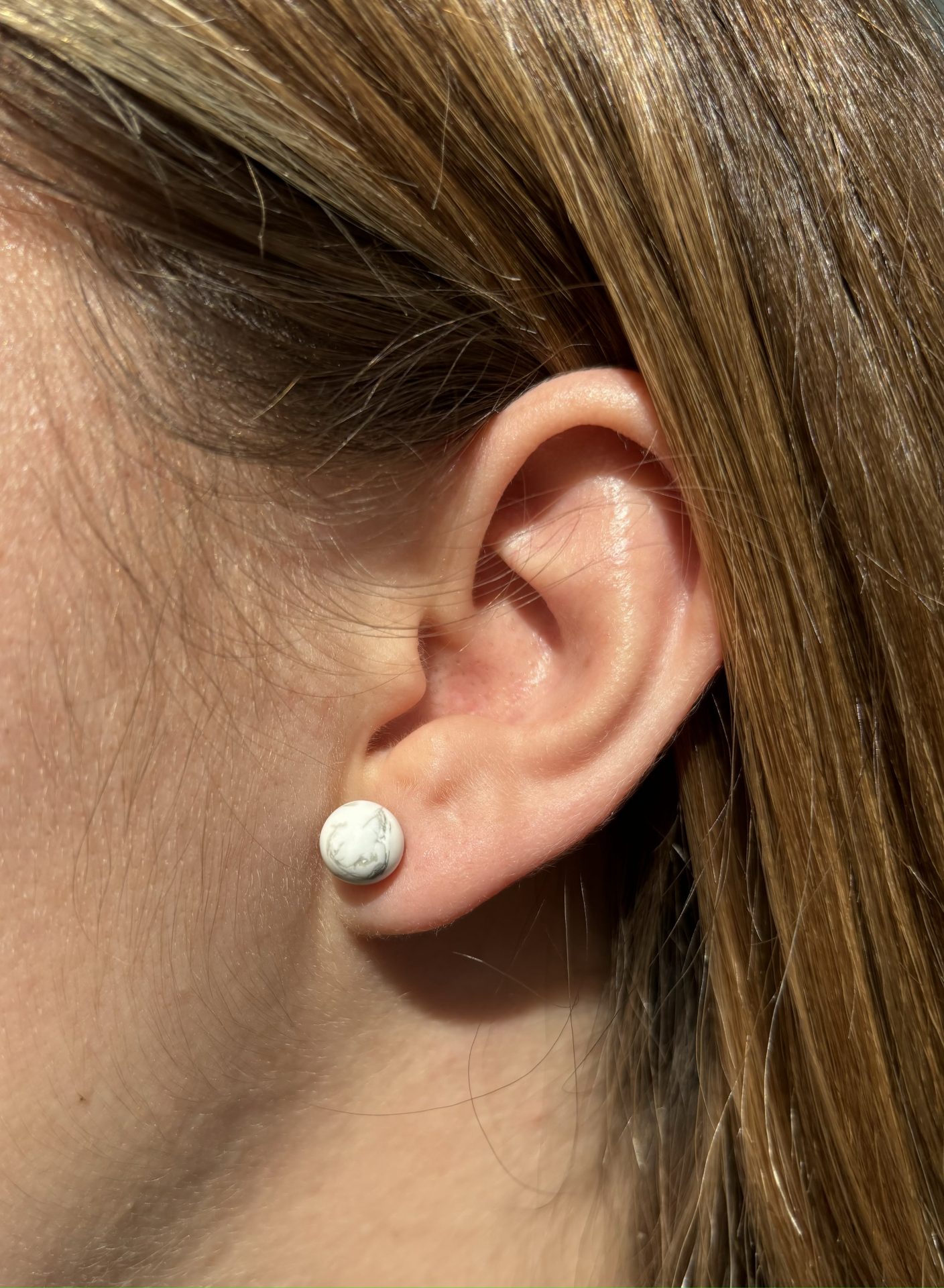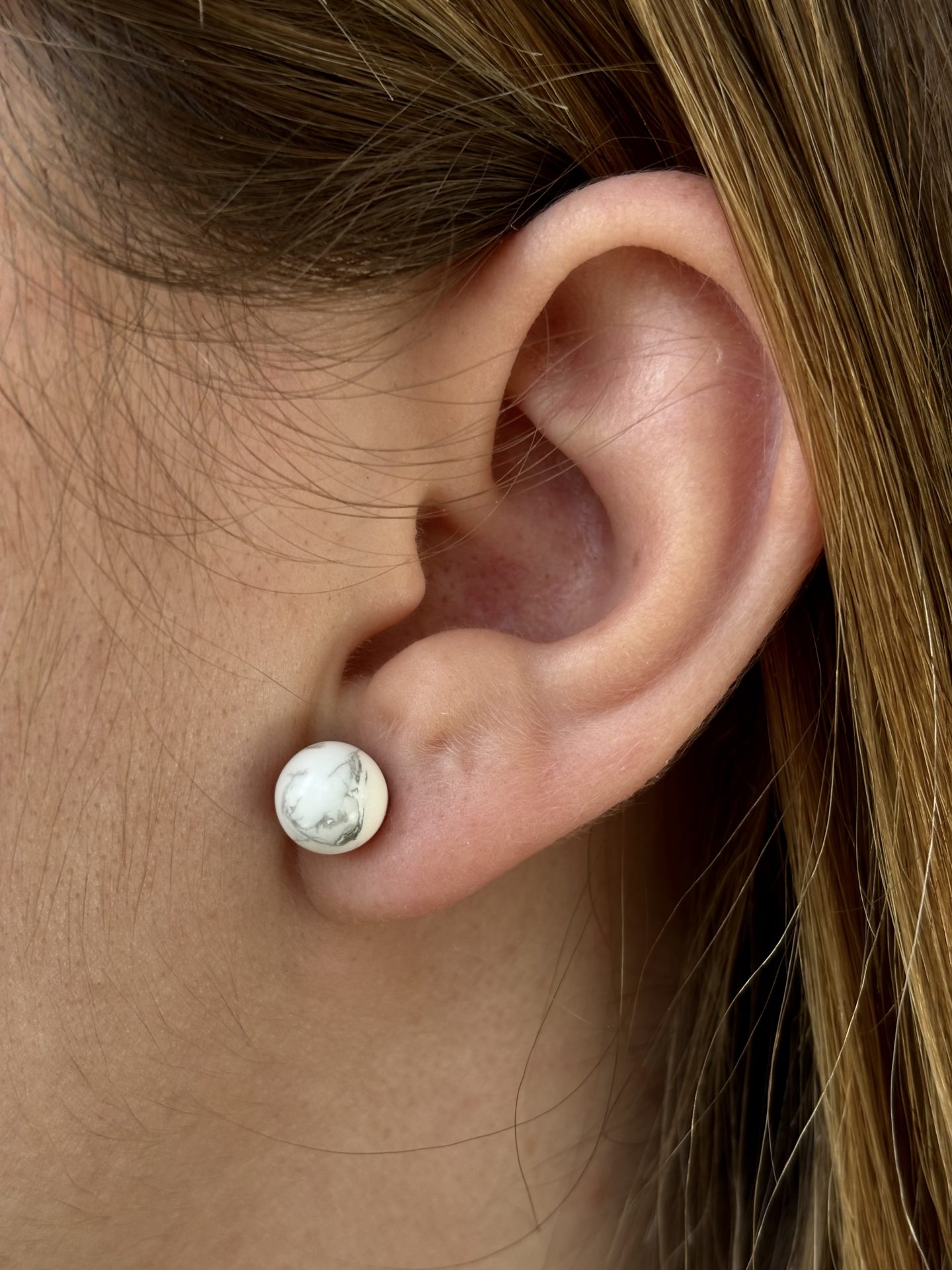 Boucles d’oreilles Magnésite (Howlite) de 8mm. Puces en argent véritable 925.