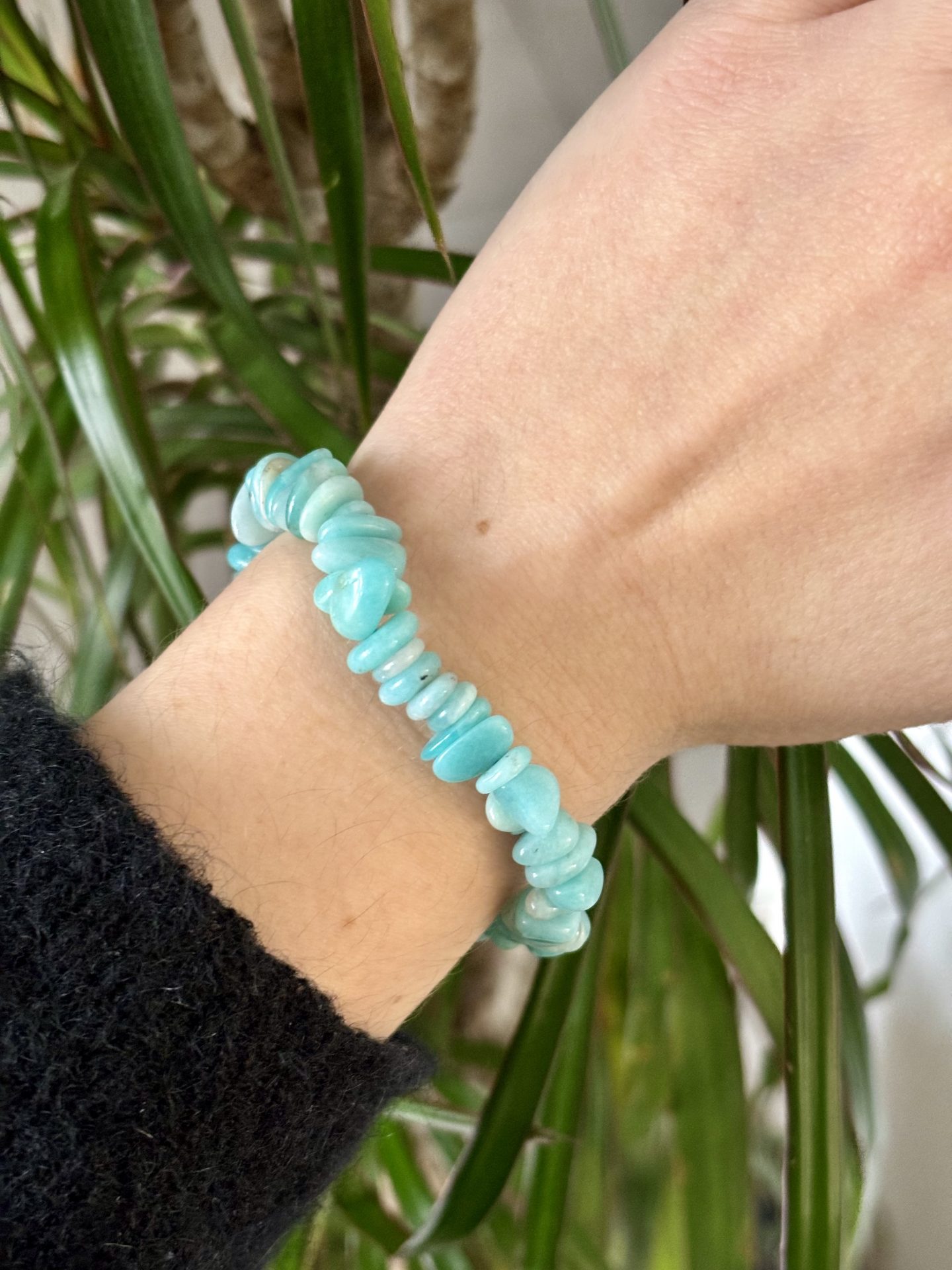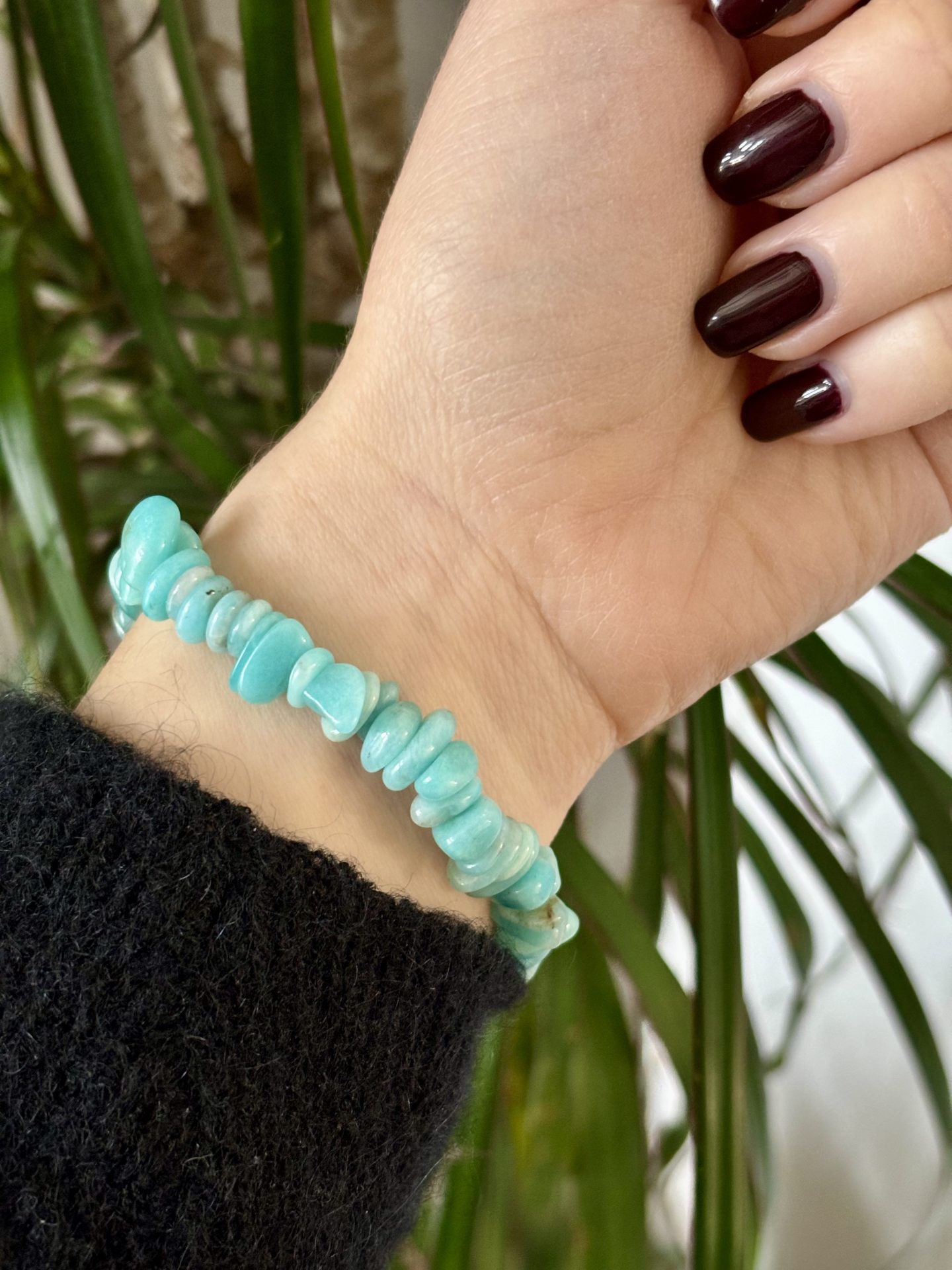 Notre bracelet Baroque Amazonite est composé d’éclats d’Amazonite de qualité AA. Il s’agit d’une pierre naturelle connue pour ses vertus apaisantes et ses effets bénéfiques sur le corps et l’esprit.