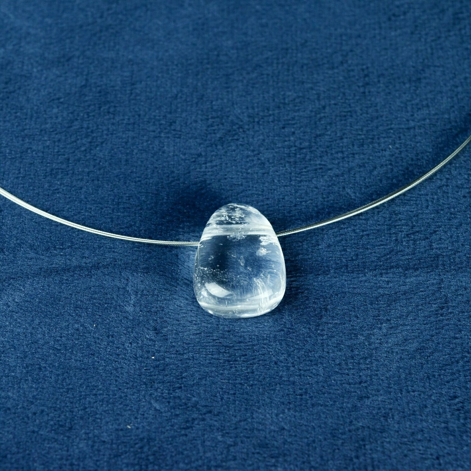 Pendentif en pierre naturelle monté sur un cordon métallique.