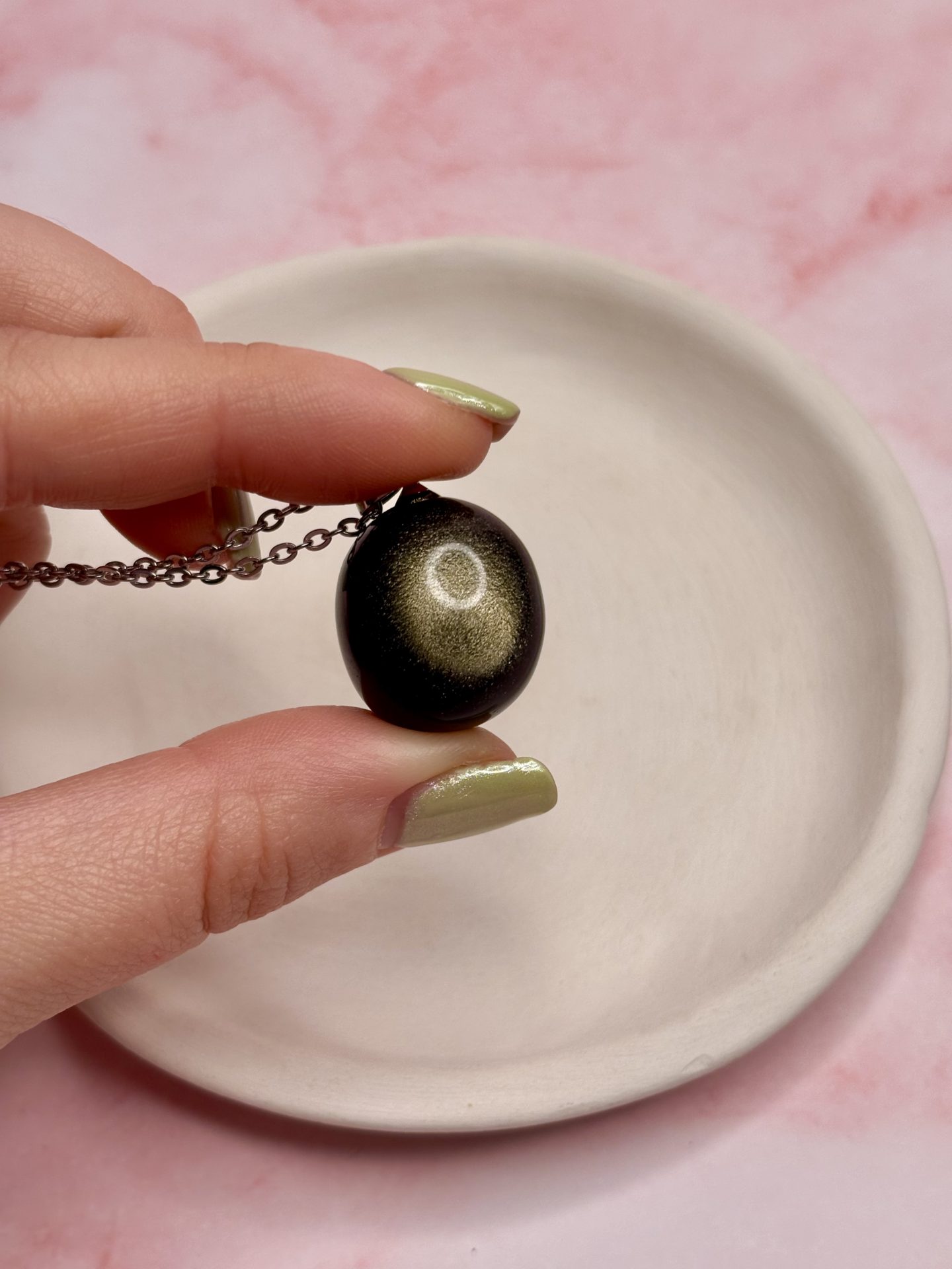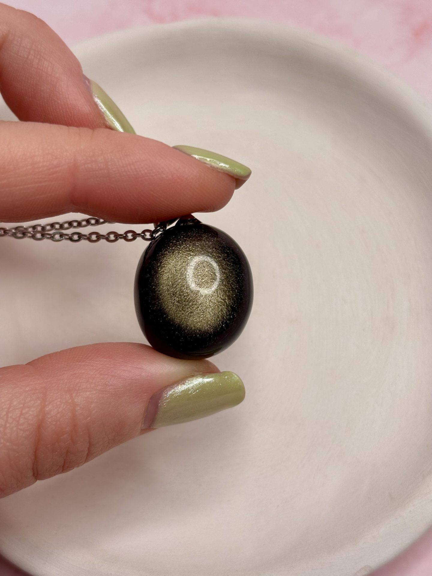 Ce collier est une pièce unique, aussi élégante que symbolique. L’obsidienne dorée est une pierre rare, recherchée pour son énergie à la fois protectrice et illuminante : elle garde, ancre et révèle.
