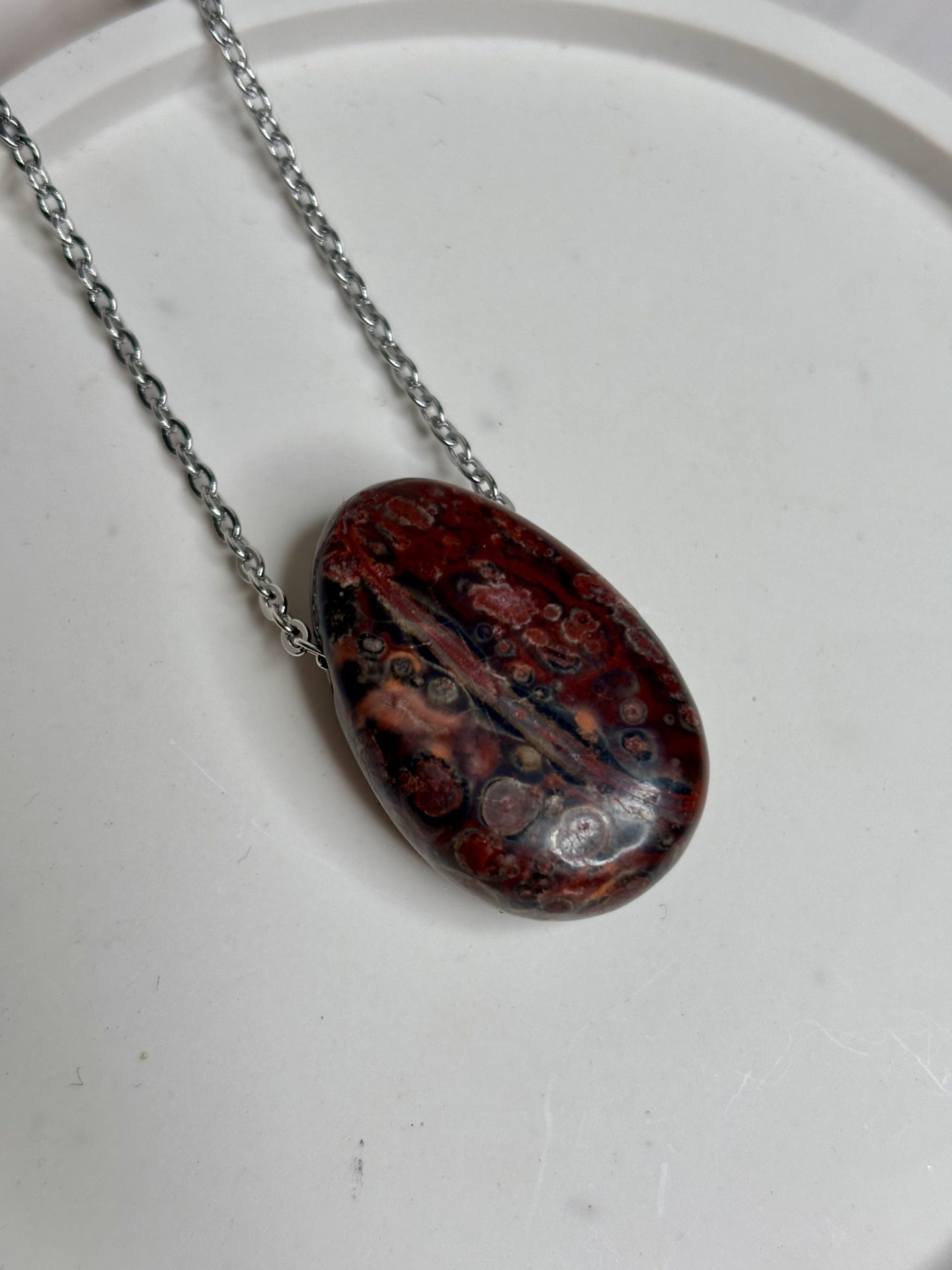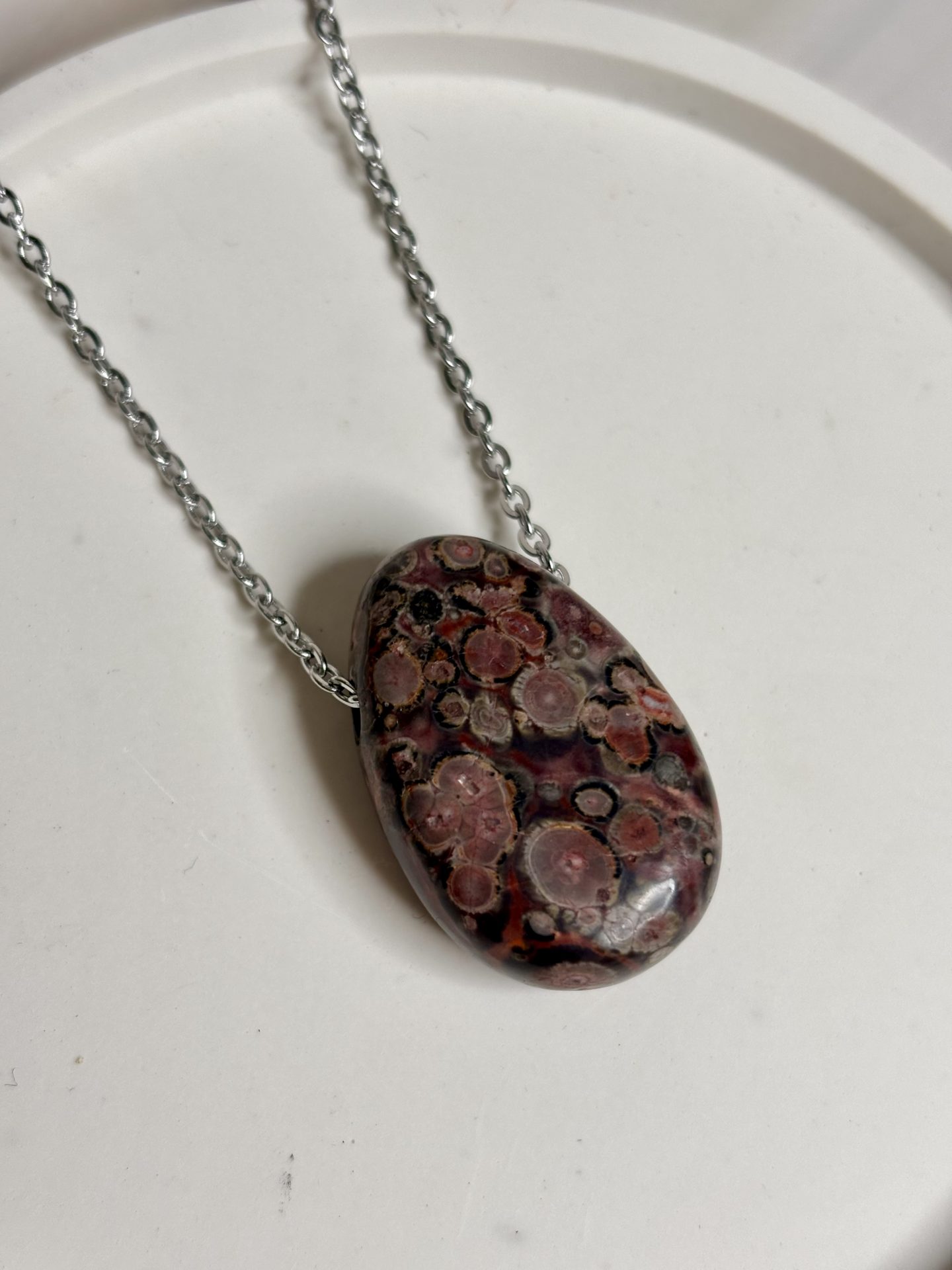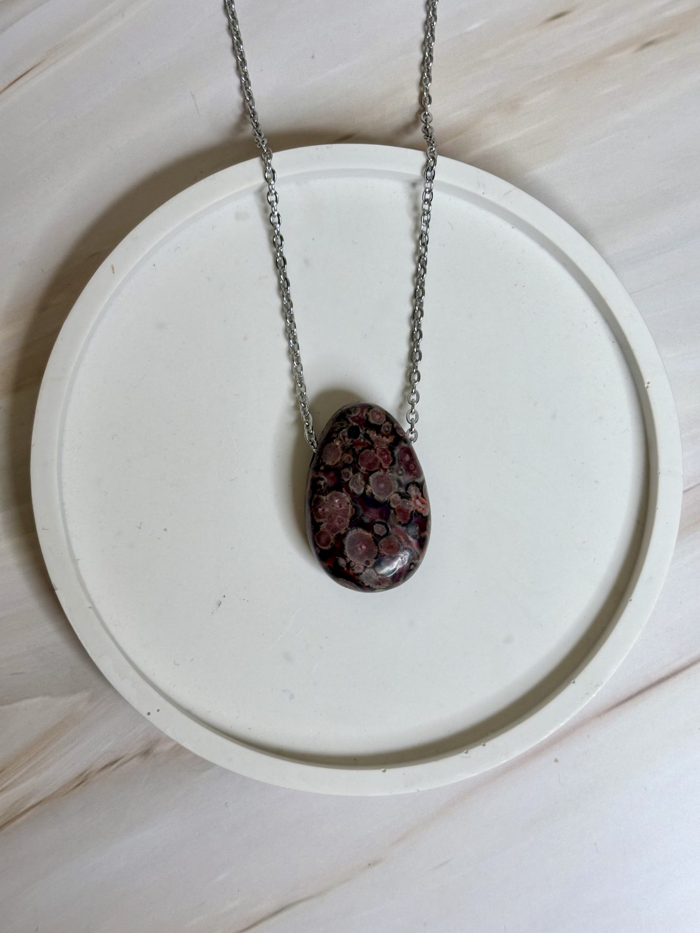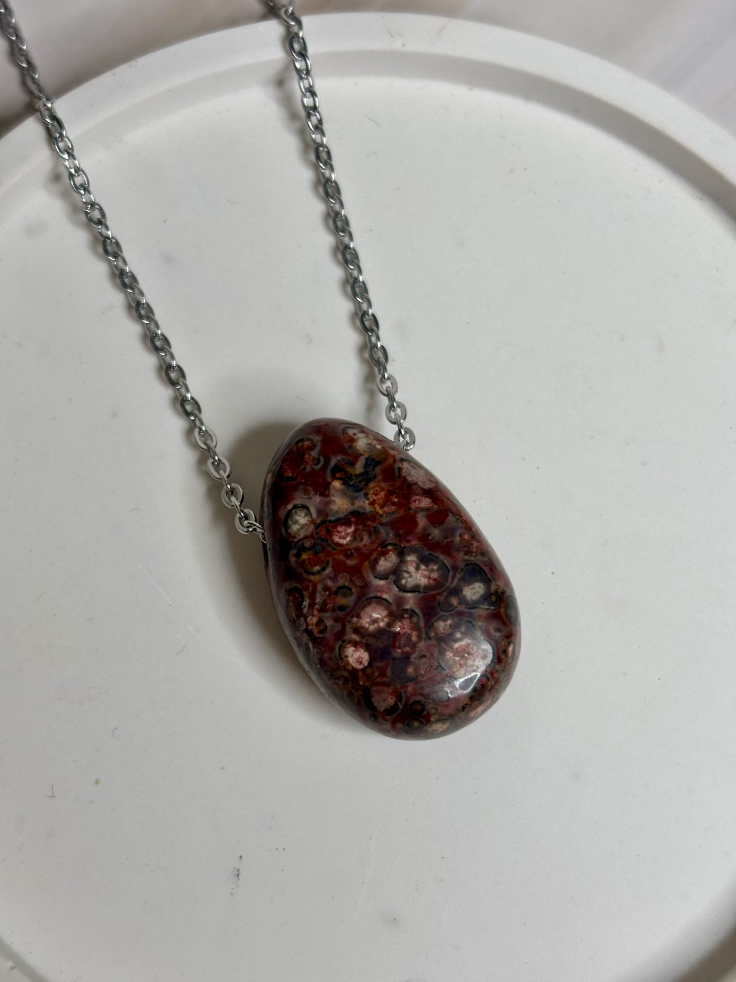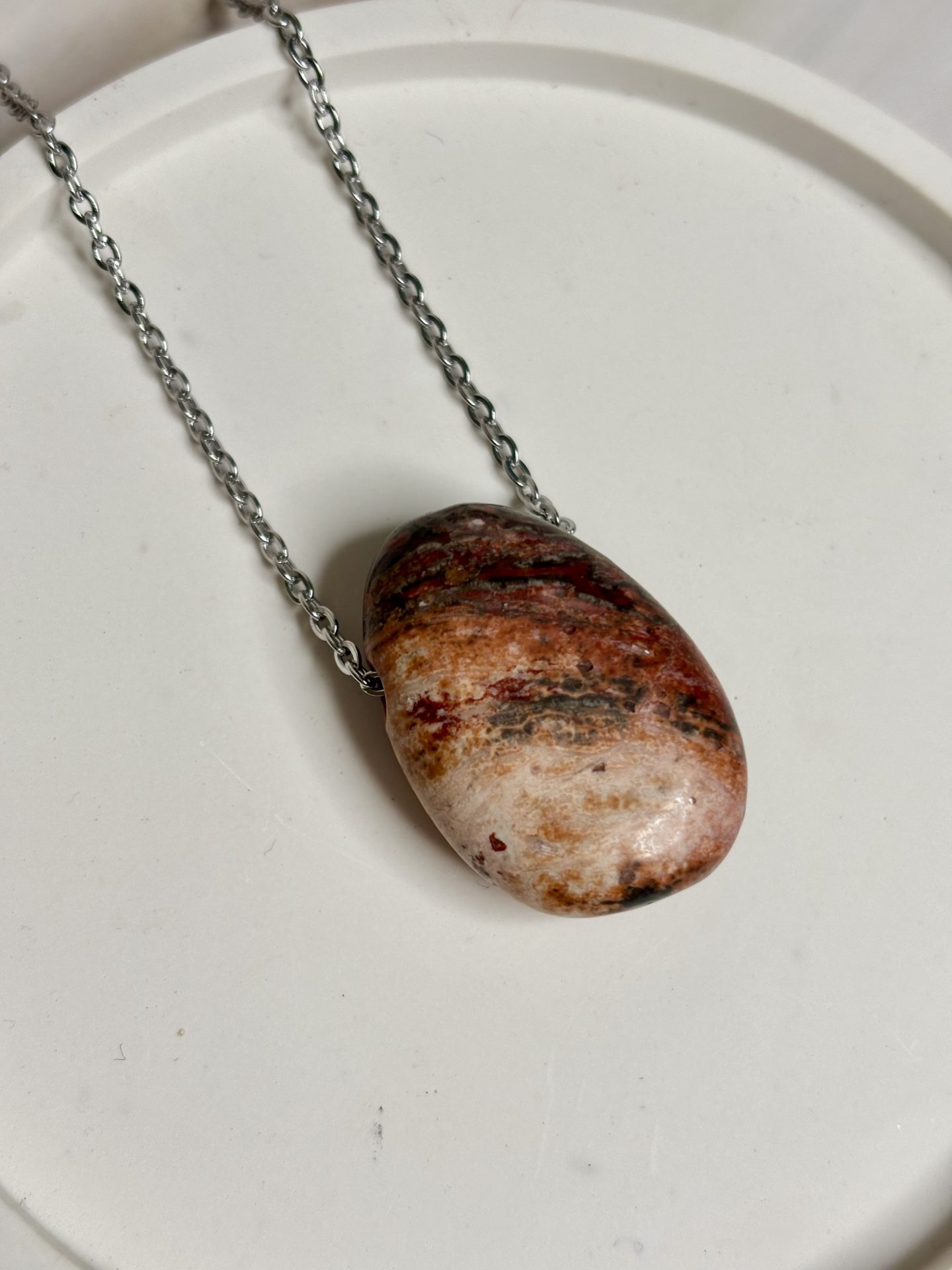 Collier artisanal en Jaspe Léopard naturel, cabochon poli monté sur une chaîne maille forçat en acier inoxydable hypoallergénique argentée de 45 cm.