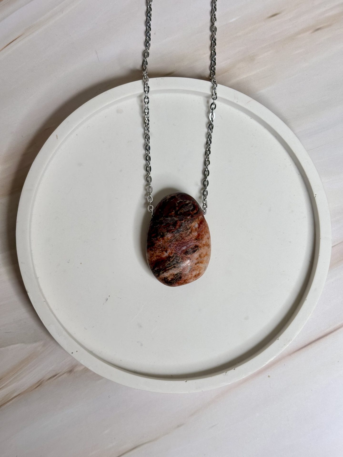 Audacieux, protecteur et profondément ancrant : le Jaspe Léopard, également appelé “Jaspe Jaguar”, est une pierre fascinante, reconnaissable à ses motifs naturels évoquant la fourrure tachetée du félin. Ce collier, monté minutieusement à la main dans notre atelier, met en valeur un cabochon poli aux teintes terreuses et aux dessins uniques — chaque pierre est littéralement une petite œuvre d’art minérale.