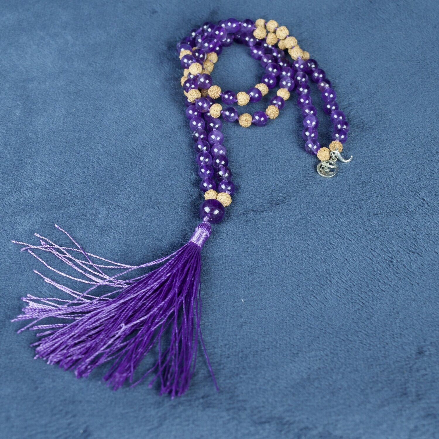Le collier Mala en Améthyste & Rudraksha est composé de :