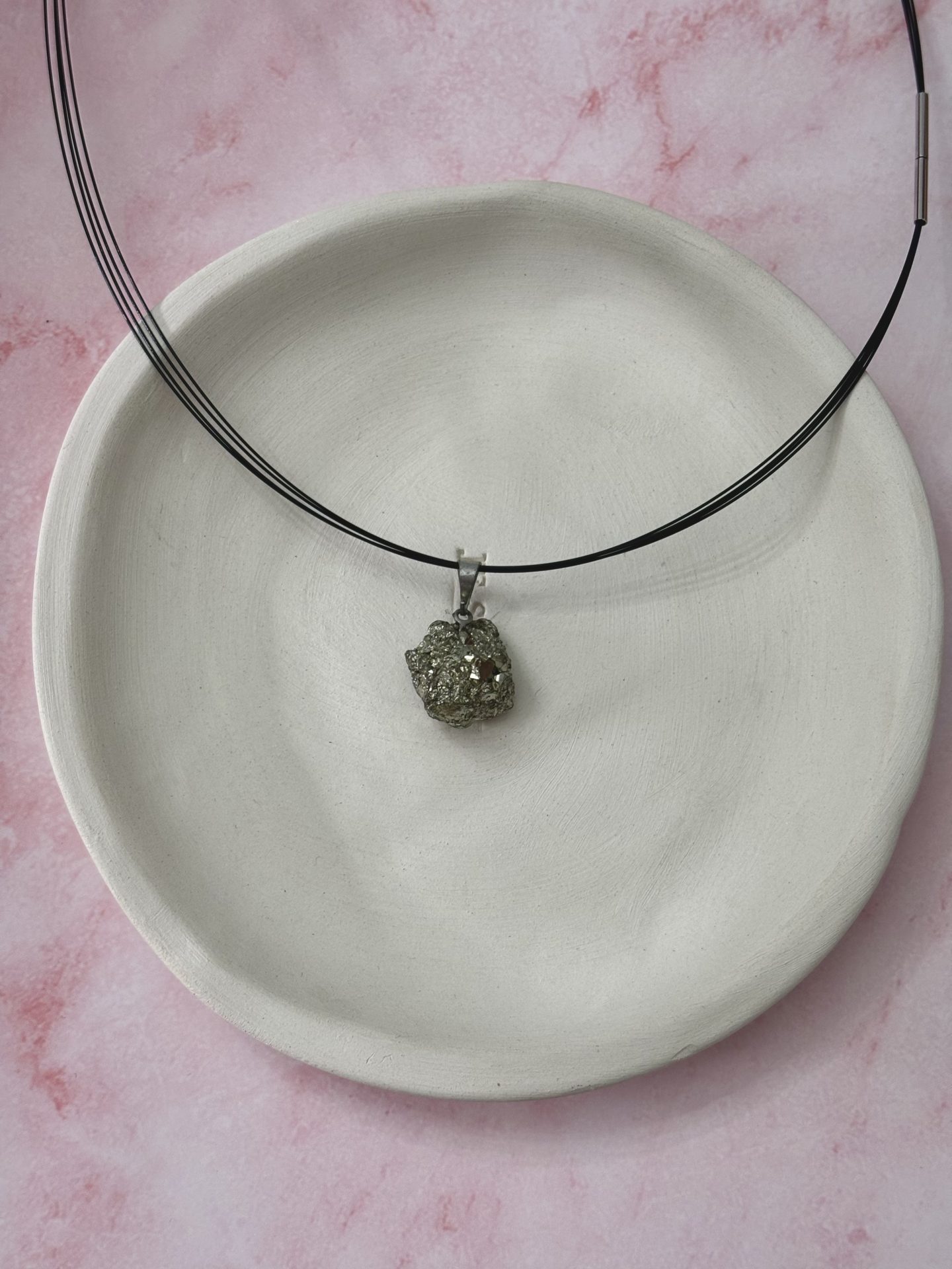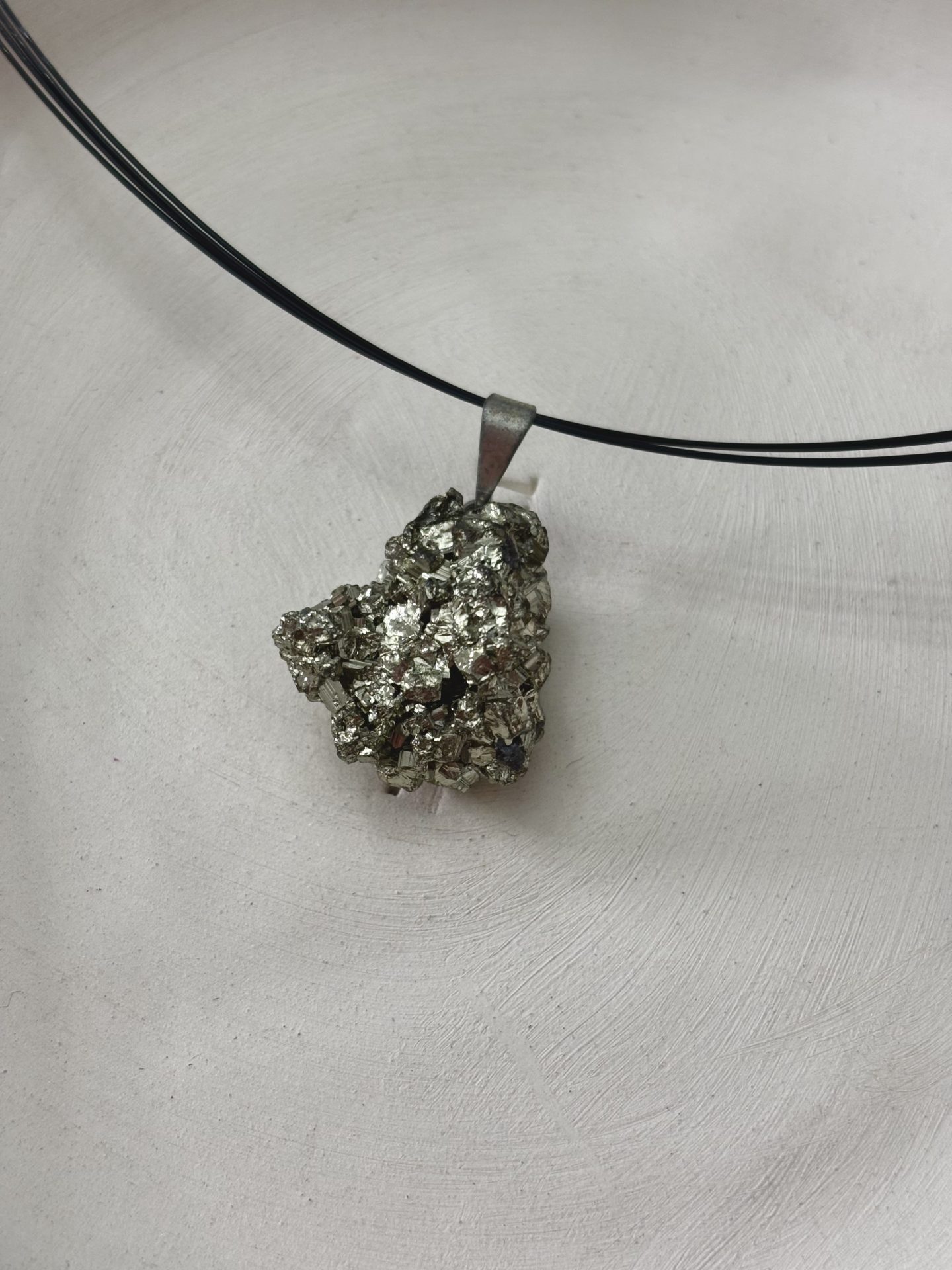 Ras du cou en Pyrite brute monté sur un cordon métallique (plusieurs cordons fins) fabriqué à la main dans notre atelier. Ras du cou. Fermoir à baïonnette. Vendu à l’unité.