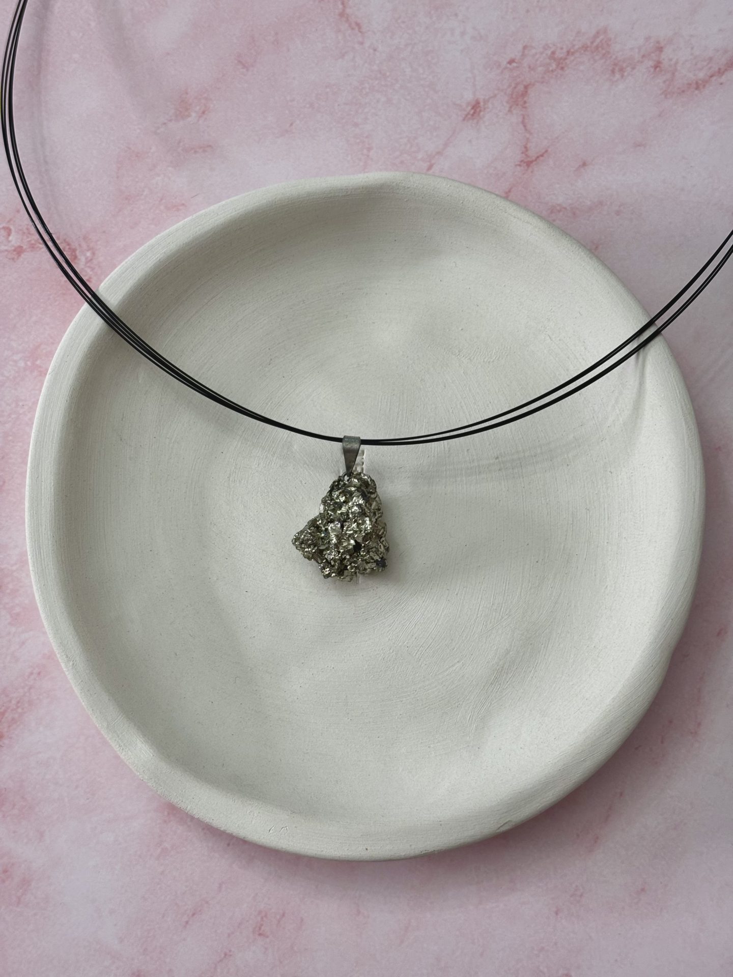 Taillée uniquement par la nature, la pyrite conserve ici toute sa texture brute, riche et scintillante, ce qui en fait bien plus qu’un bijou : un véritable talisman personnel.