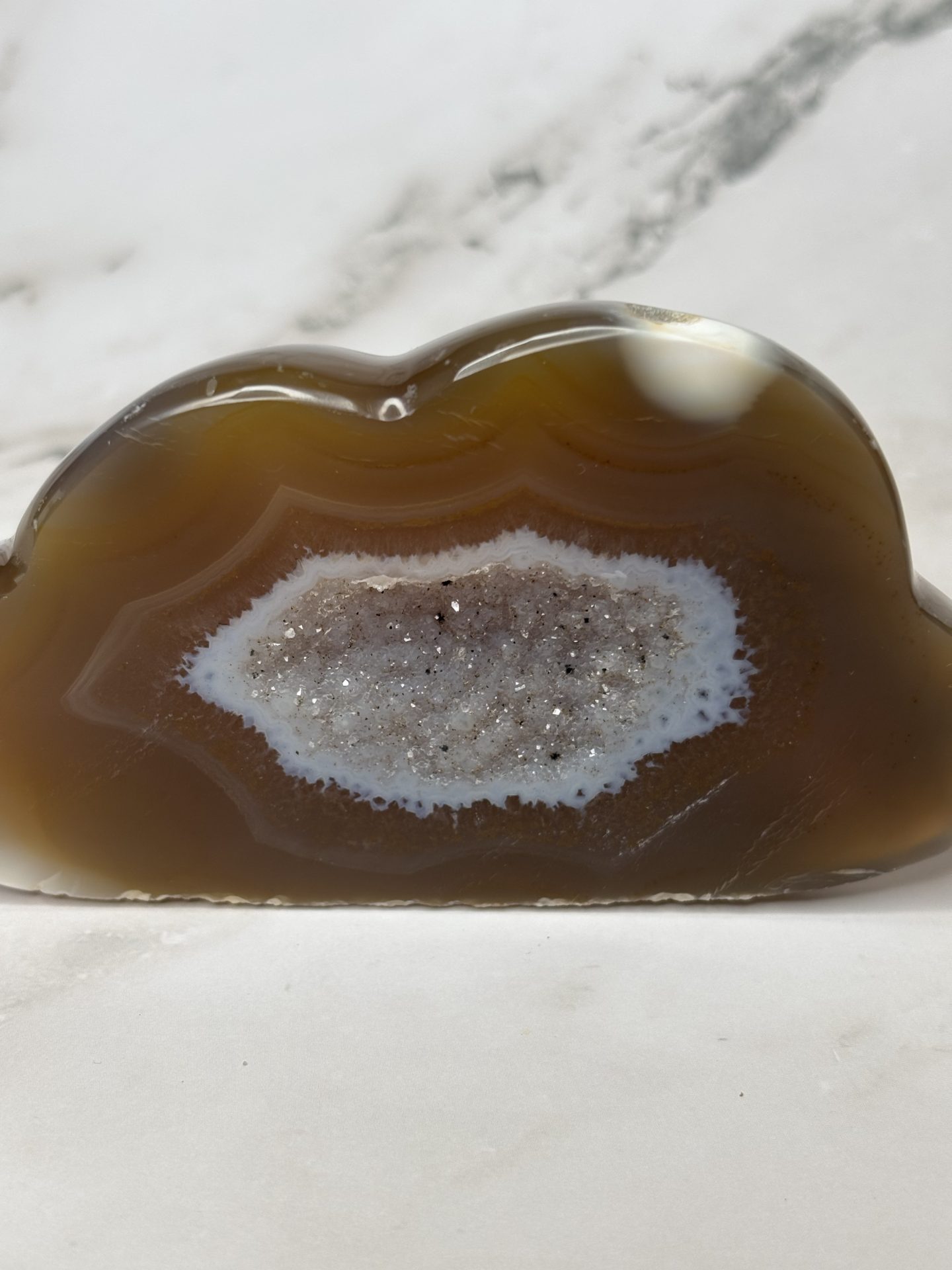 Géode d’Agate du Brésil de qualité extra taillée à la main en forme de nuage. Pièce unique et élégante avec une cavité centrale révélant de magnifiques cristaux d’agate scintillants, cette géode est à la fois un objet de décoration raffiné et un puissant allié en lithothérapie.