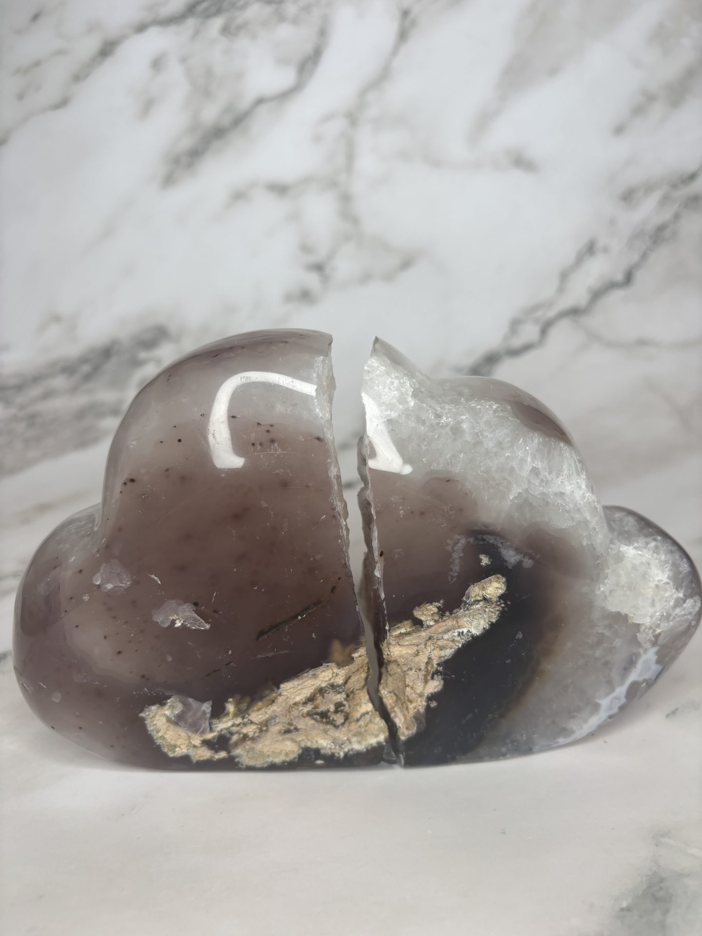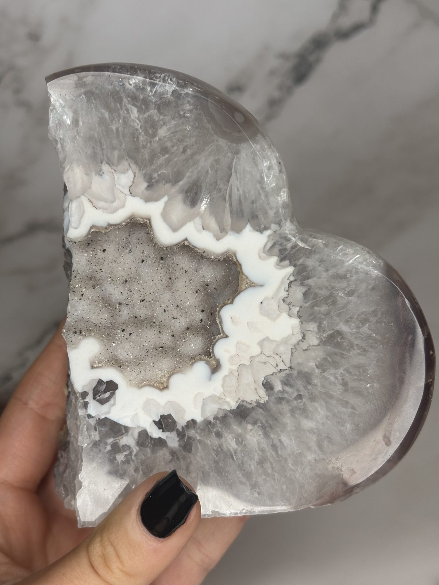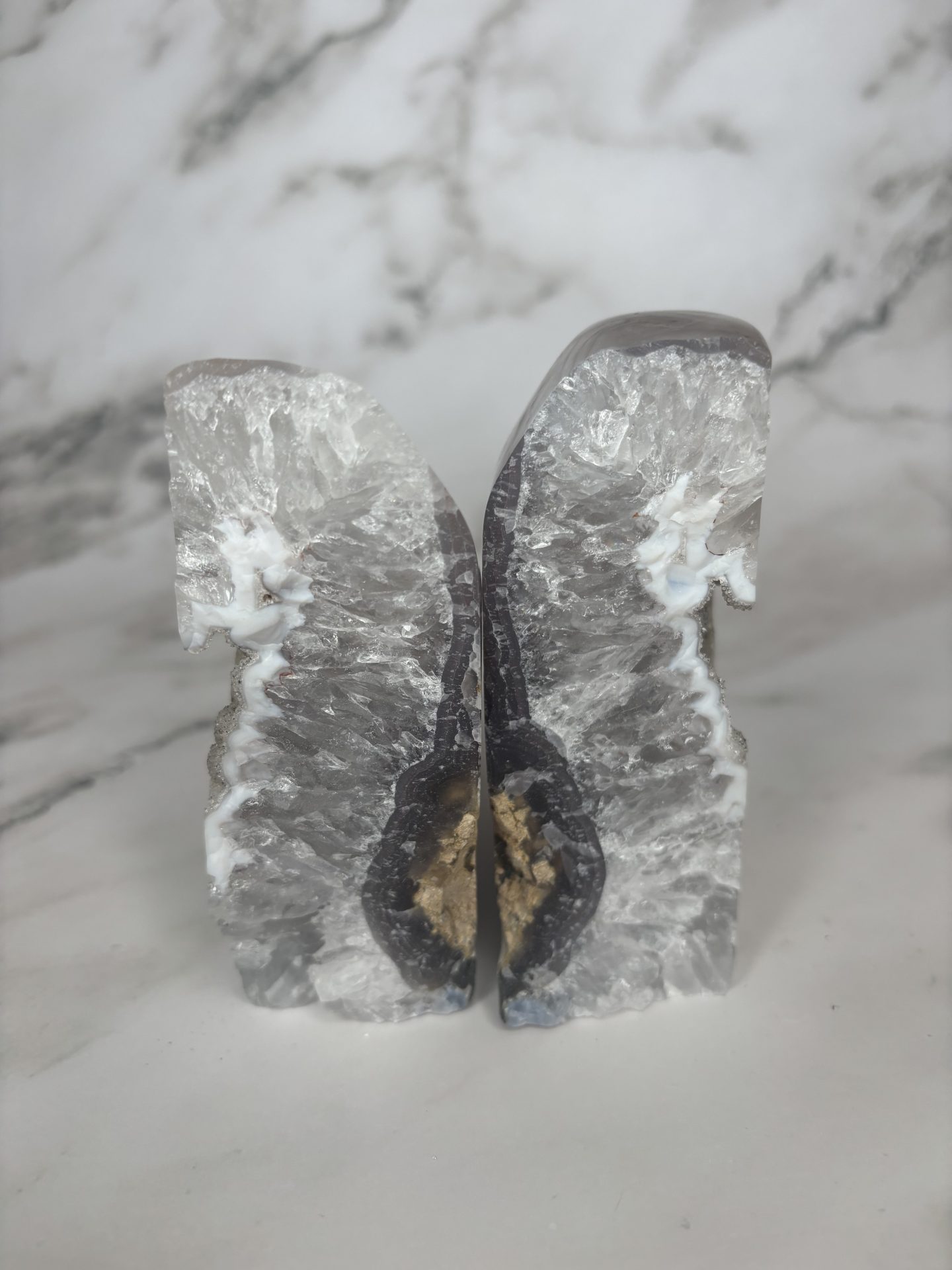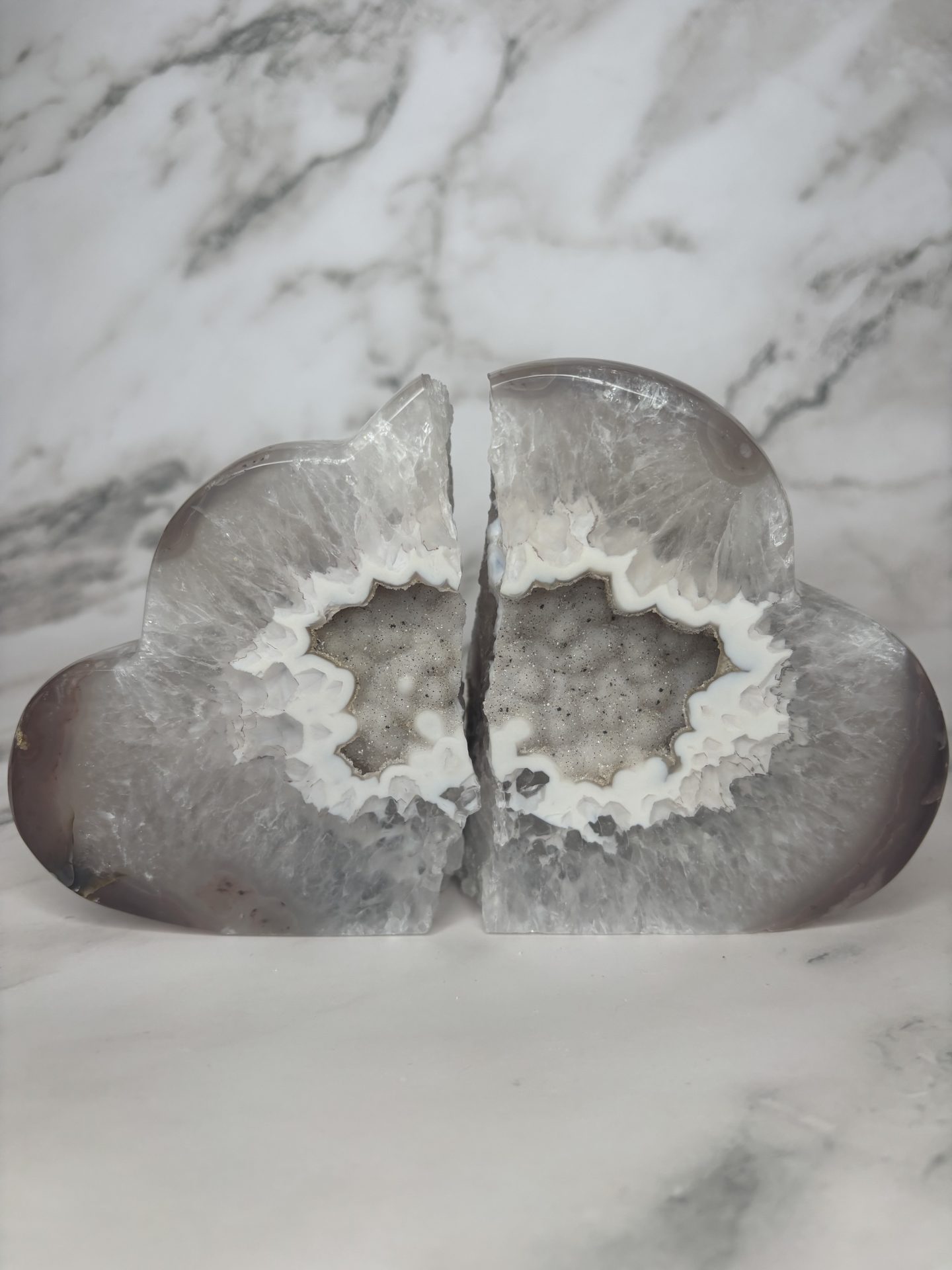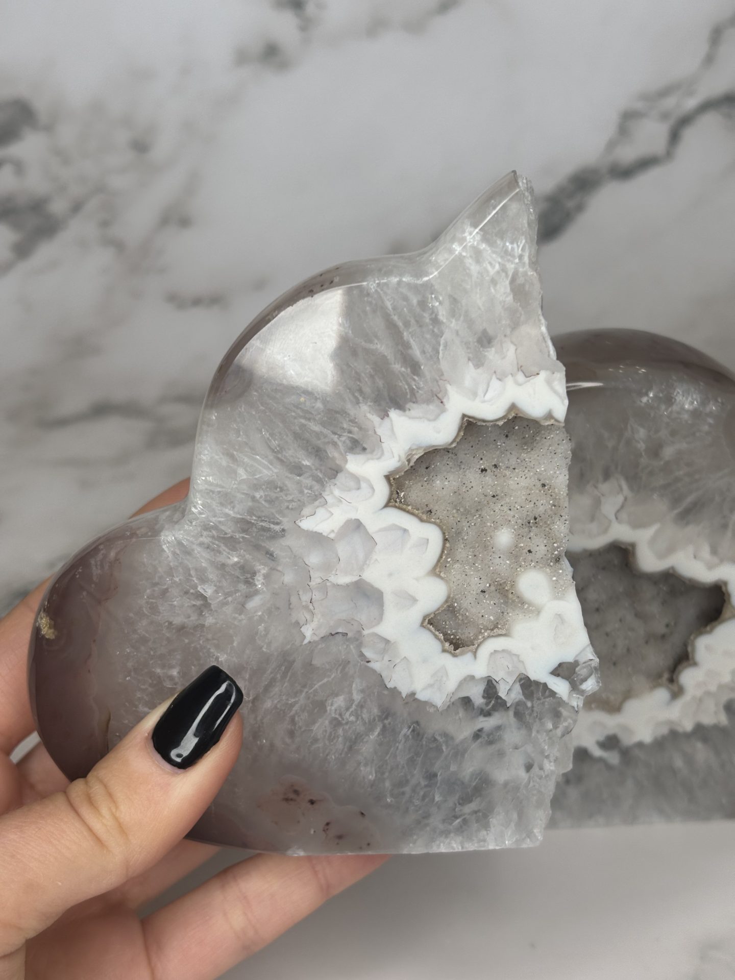 Cette géode d’agate en forme de nuage fait partie de notre collection « Les Presque Parfaites » : légèrement brisée, mais toujours aussi belle. Ses cristaux scintillent avec la même intensité et ses bienfaits en lithothérapie restent intacts (apaisement, ancrage, harmonie).
