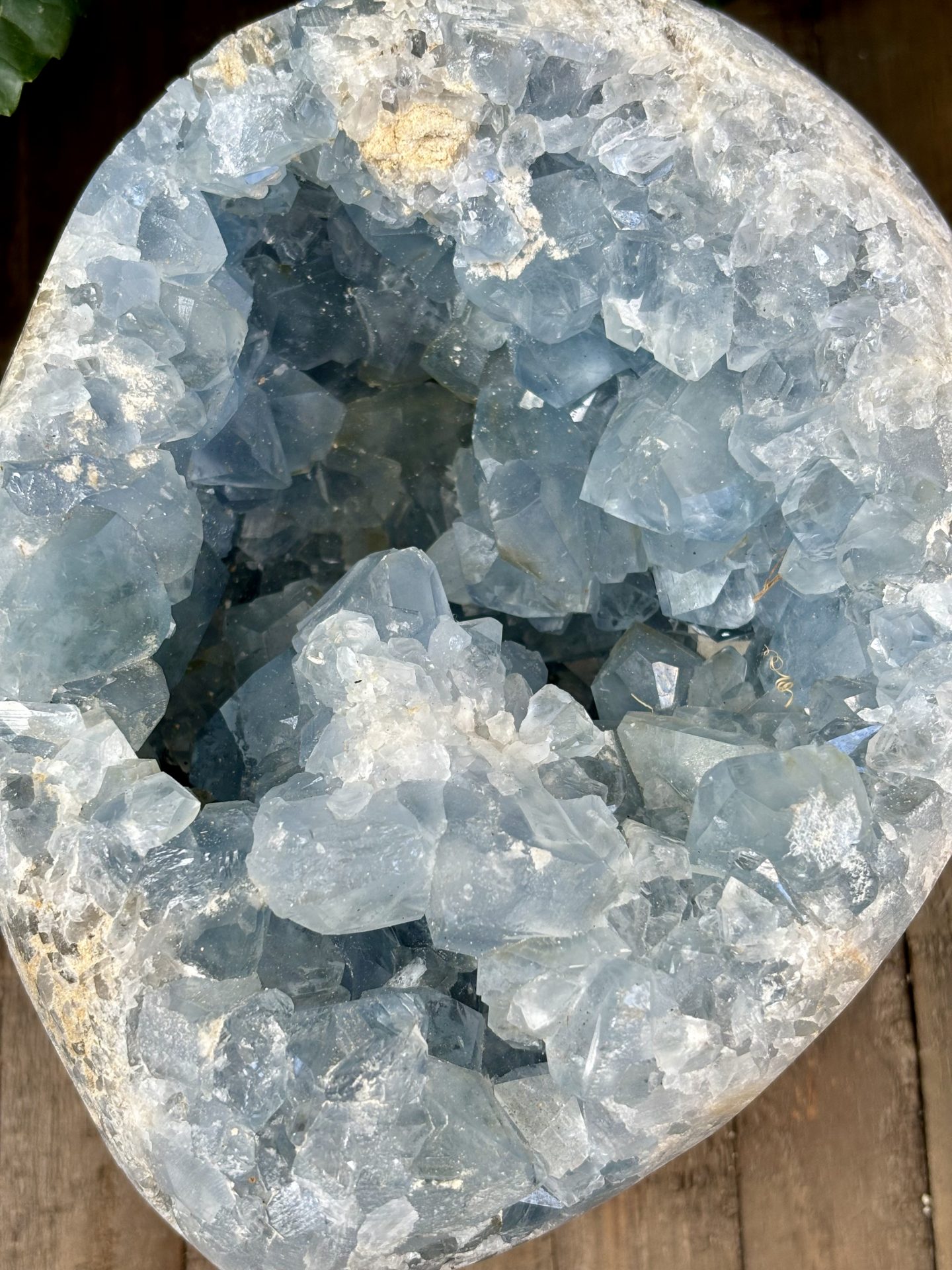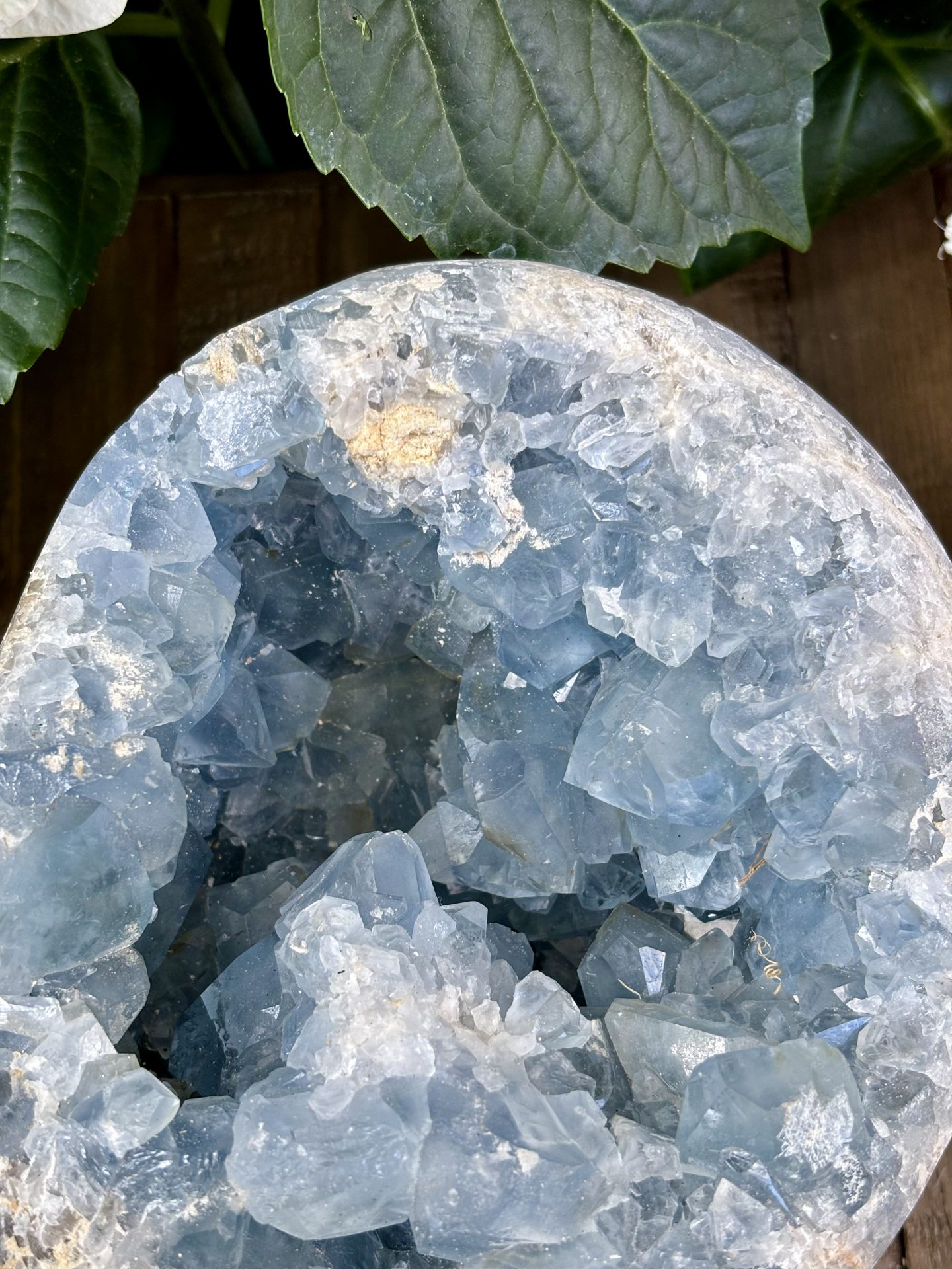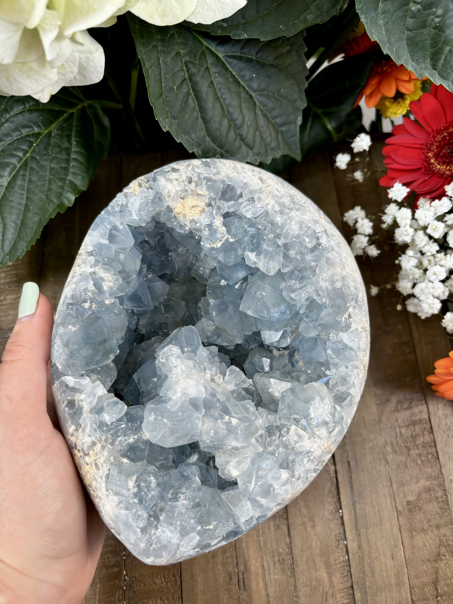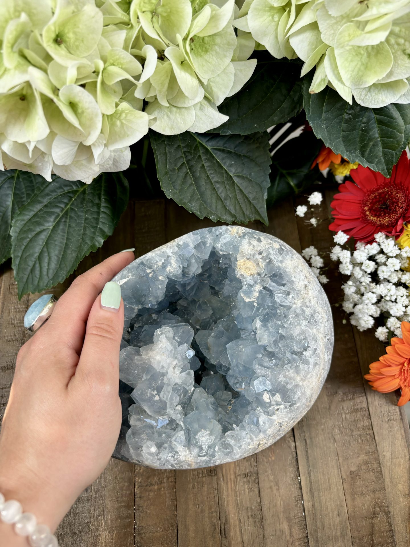 ⚠️ La Célestine est un minéral friable (dureté 3 sur l’échelle de Mohs), il est donc possible de trouver de petits morceaux à la réception des géodes. La Célestine comporte naturellement des imperfections (Trous, cavités, fissures) qu’il est possible de retrouver sur les géodes.