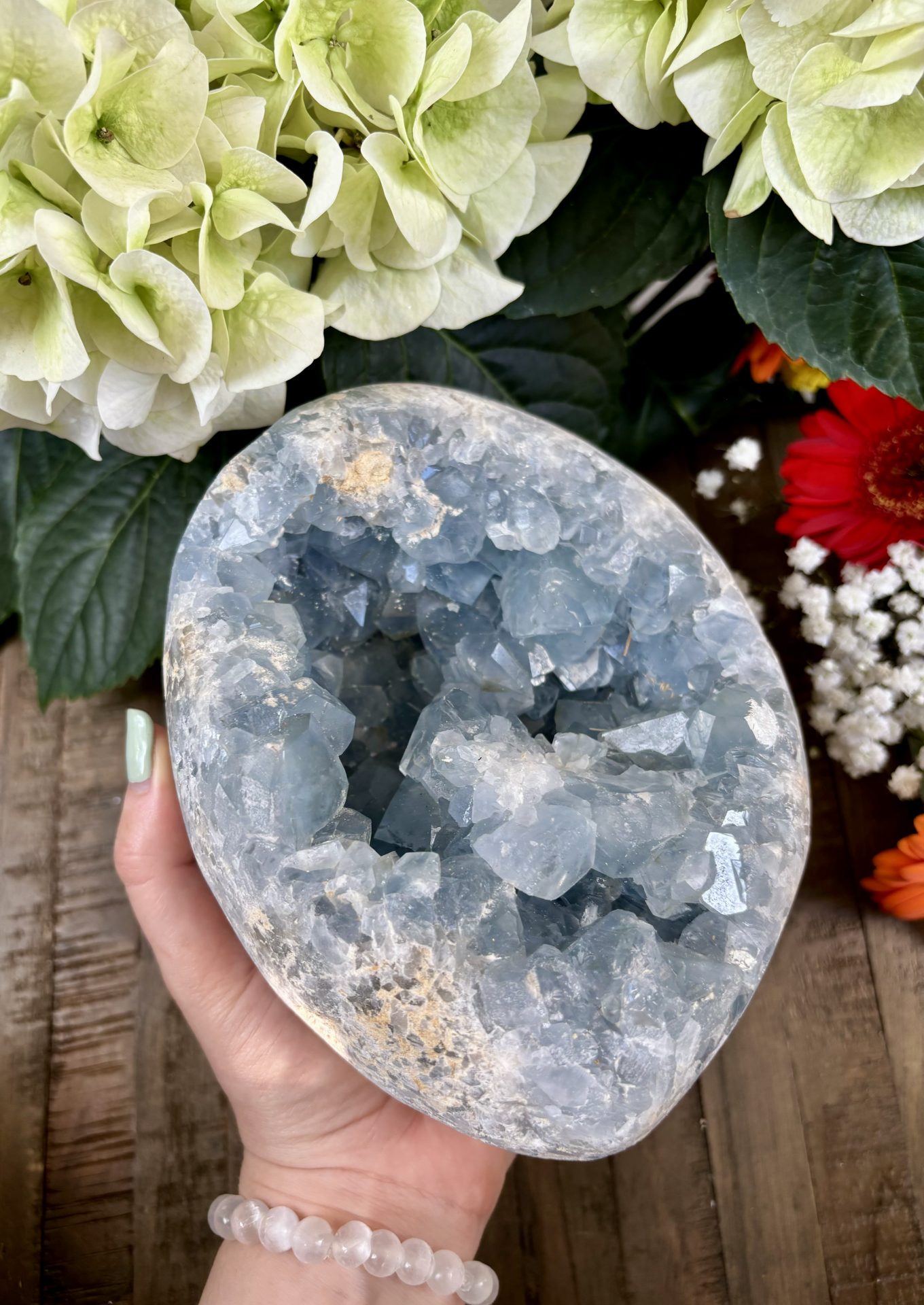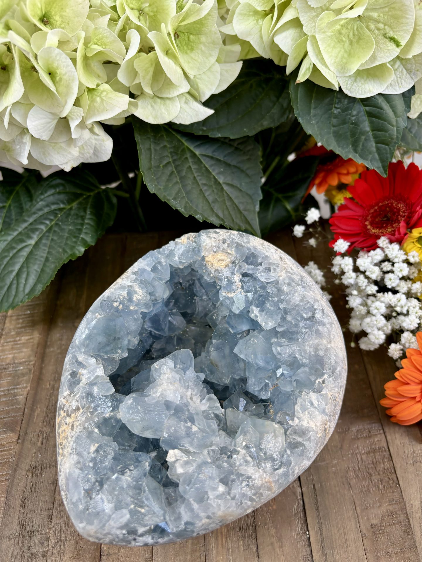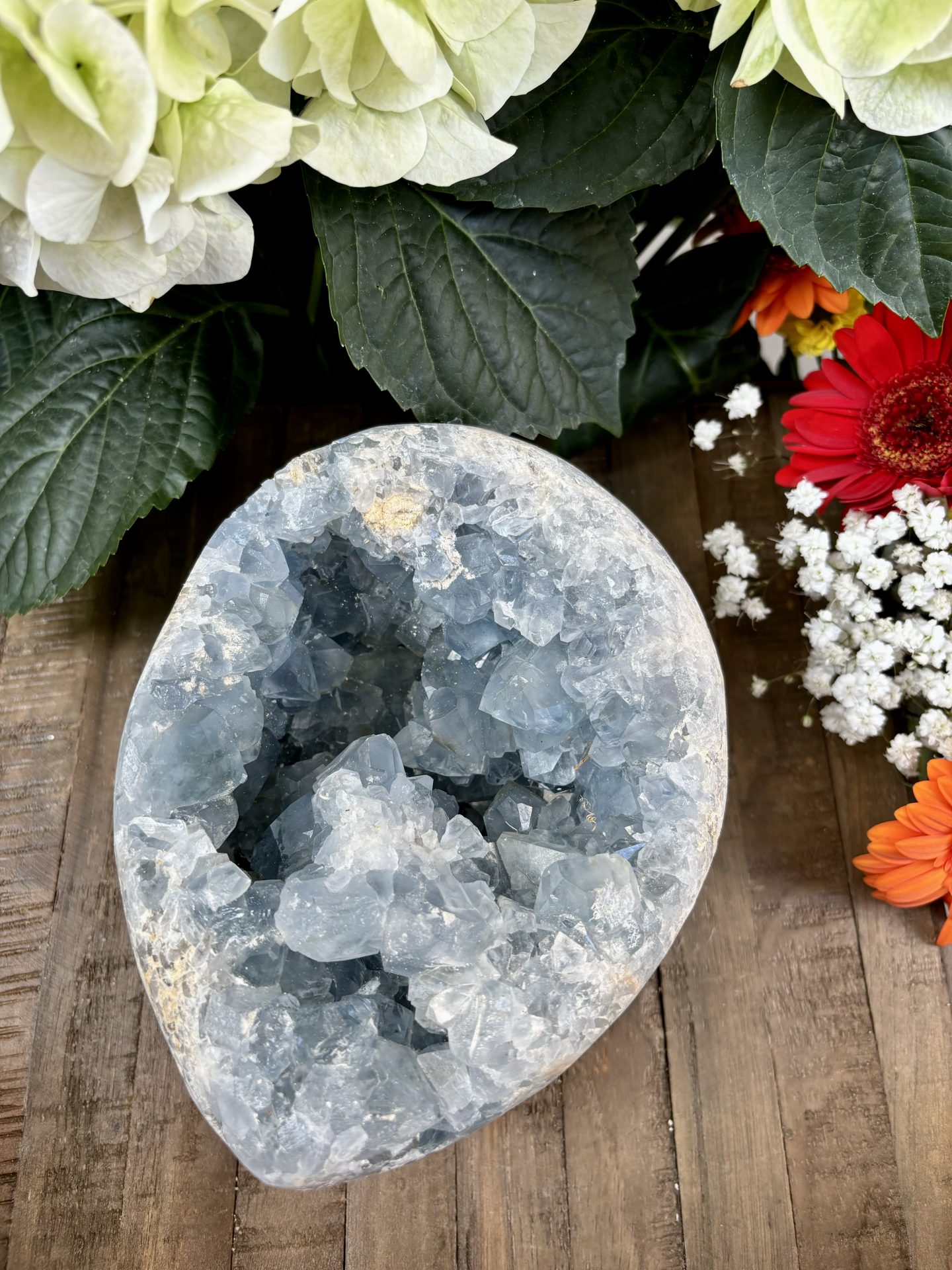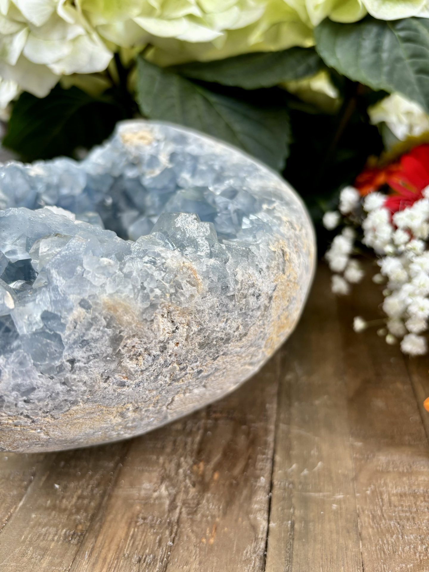 ⚠️ La Célestine est un minéral friable (dureté 3 sur l’échelle de Mohs), il est donc possible de trouver de petits morceaux à la réception des géodes. La Célestine comporte naturellement des imperfections (Trous, cavités, fissures) qu’il est possible de retrouver sur les géodes.