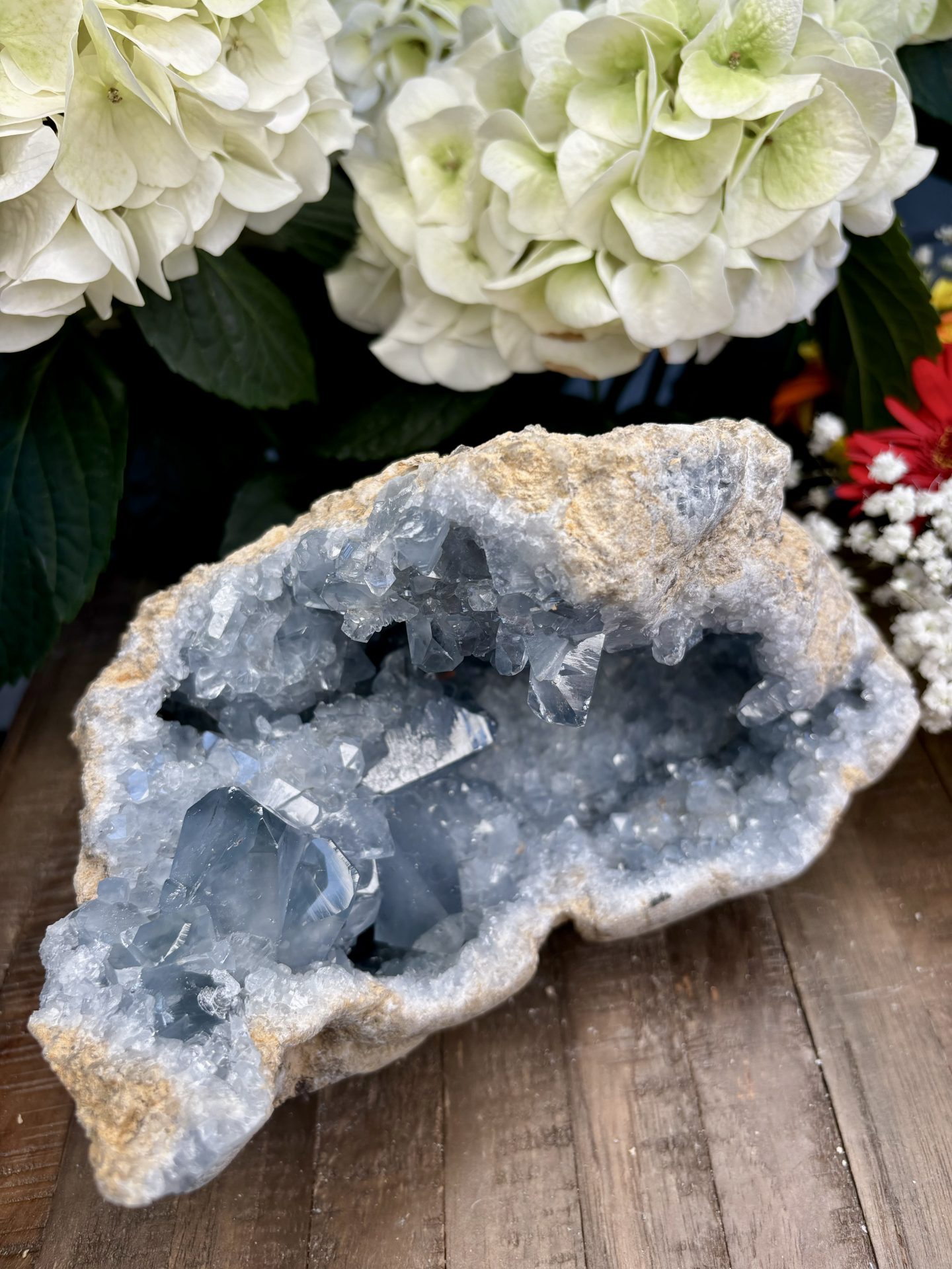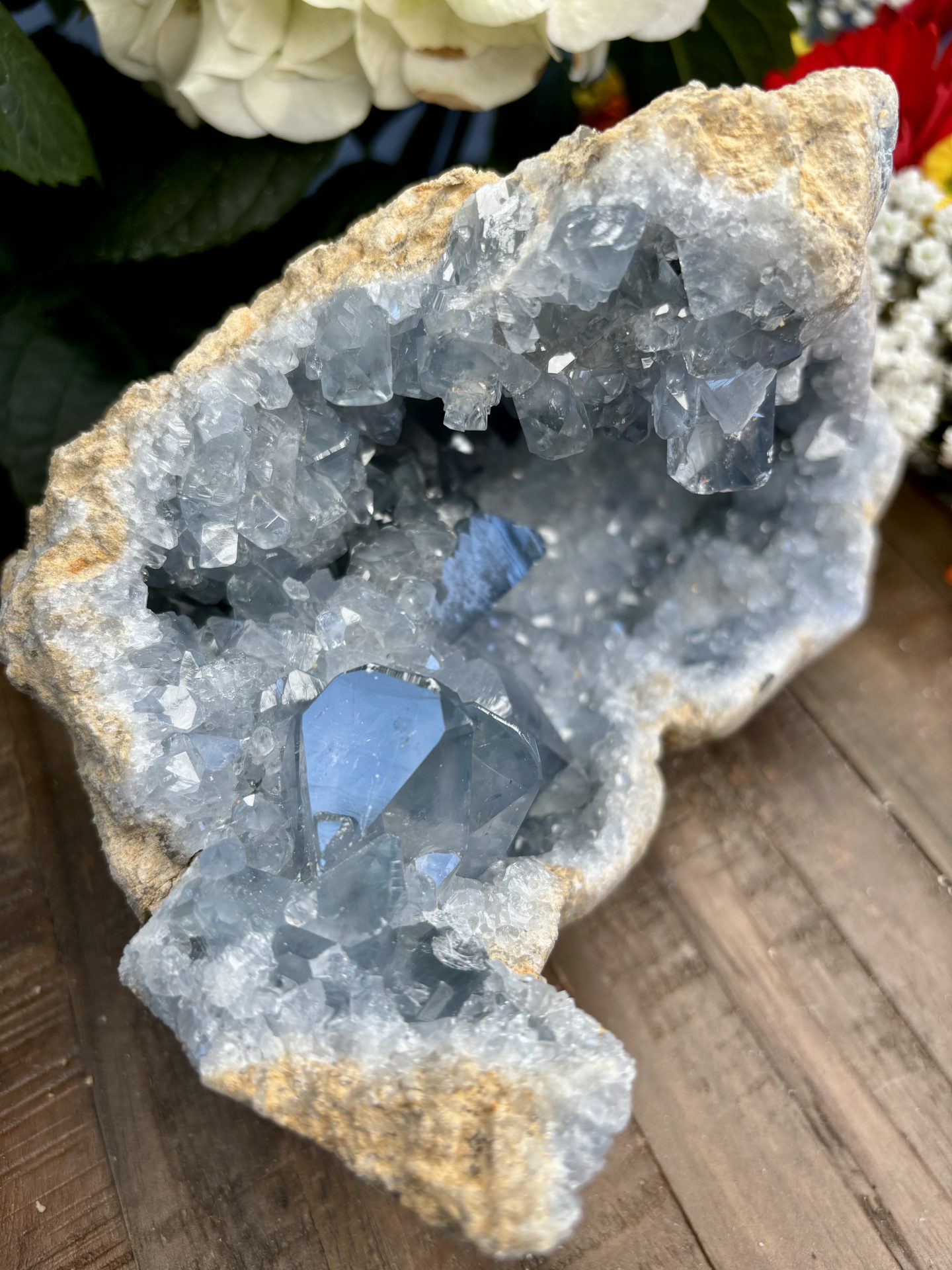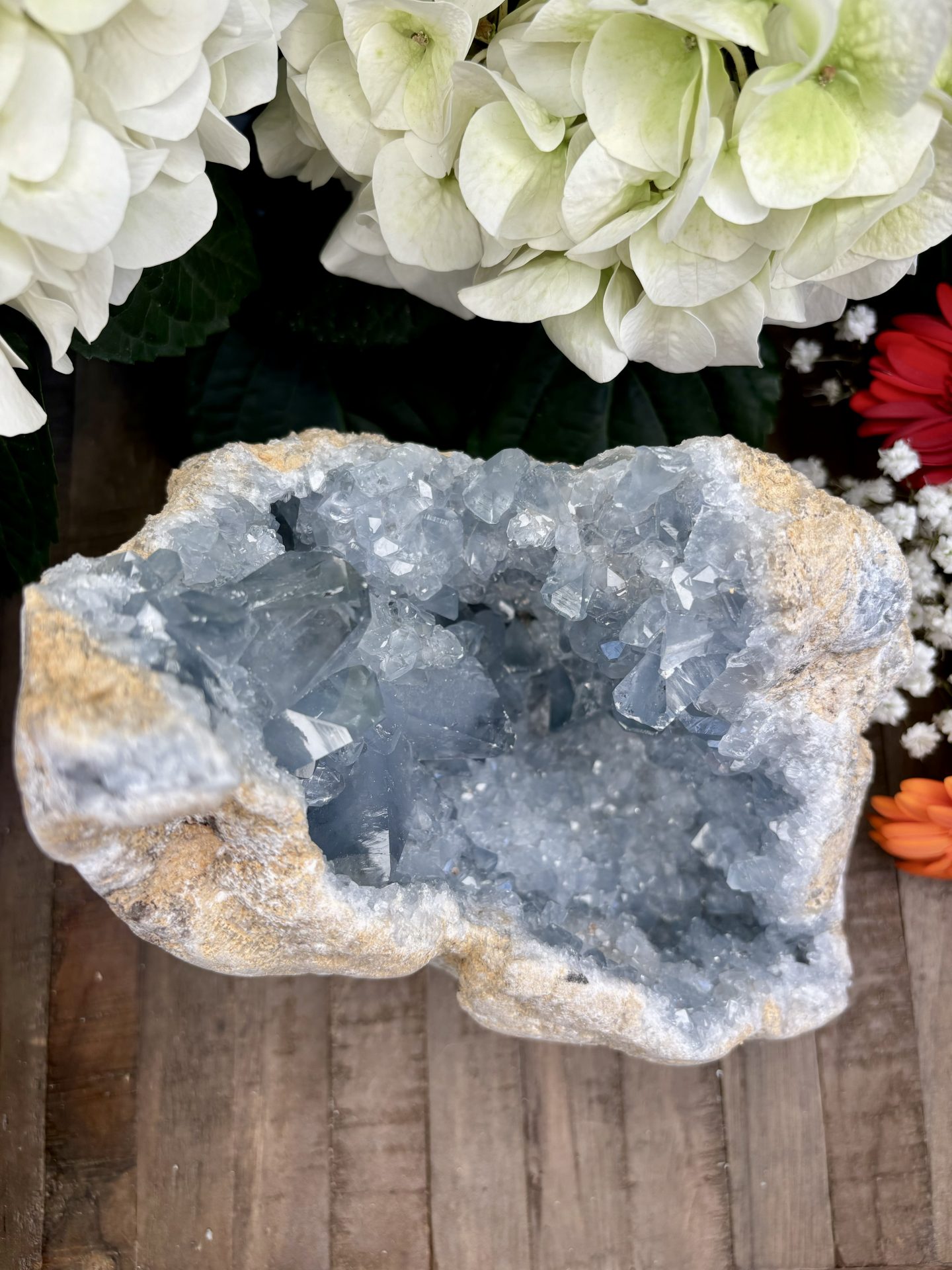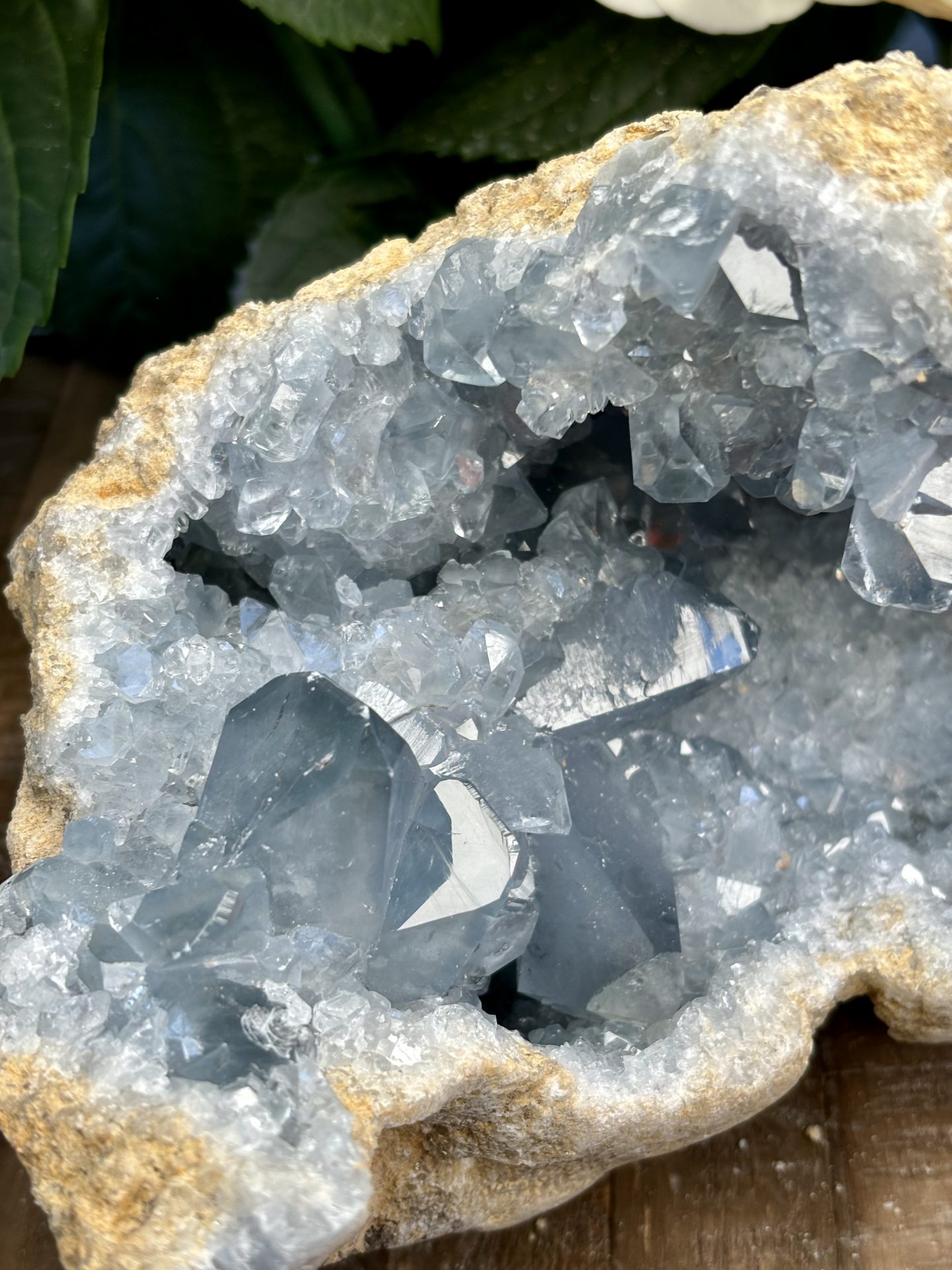 ⚠️ La Célestine est un minéral friable (dureté 3 sur l’échelle de Mohs), il est donc possible de trouver de petits morceaux à la réception des géodes. La Célestine comporte naturellement des imperfections (Trous, cavités, fissures) qu’il est possible de retrouver sur les géodes.