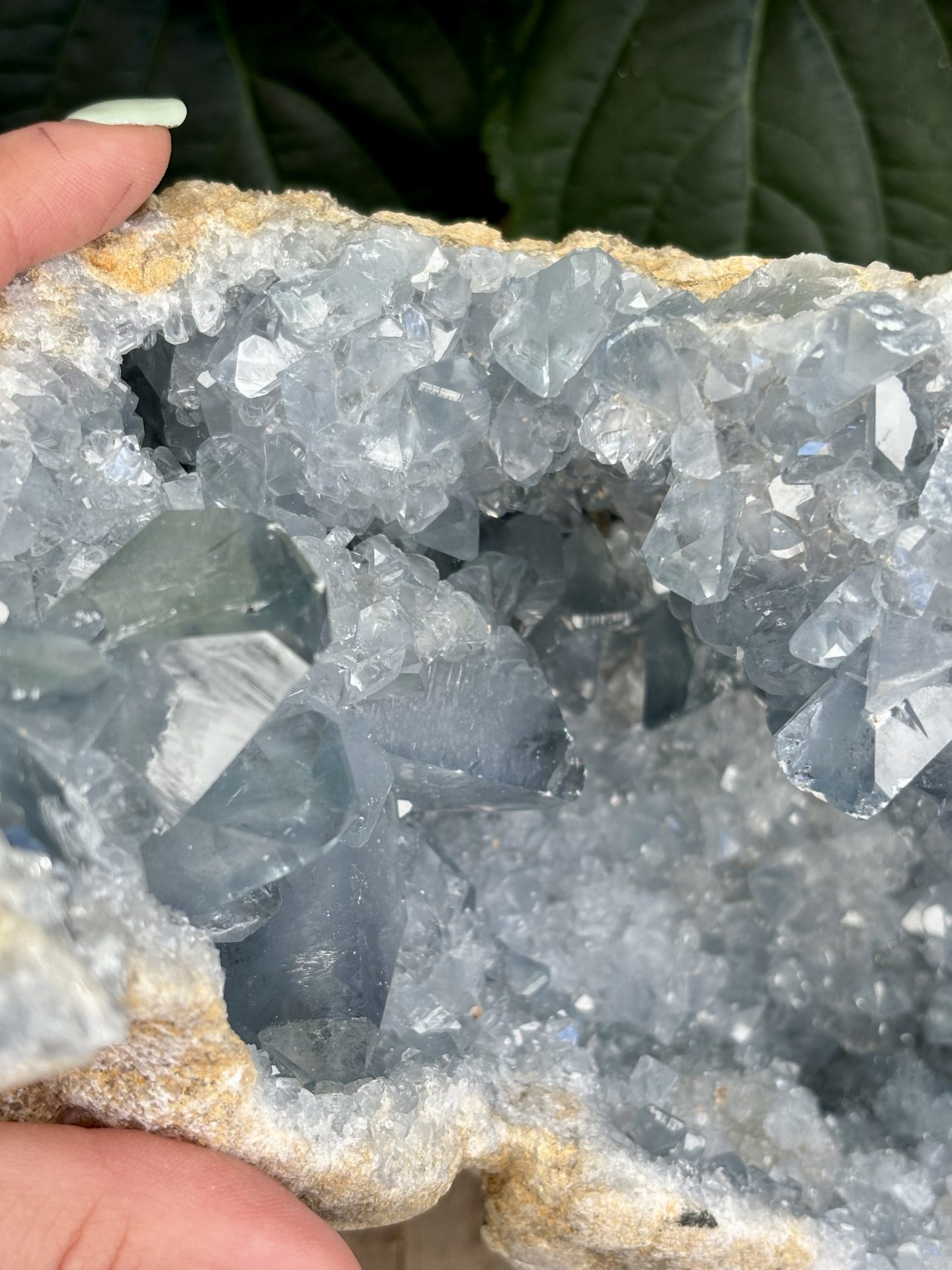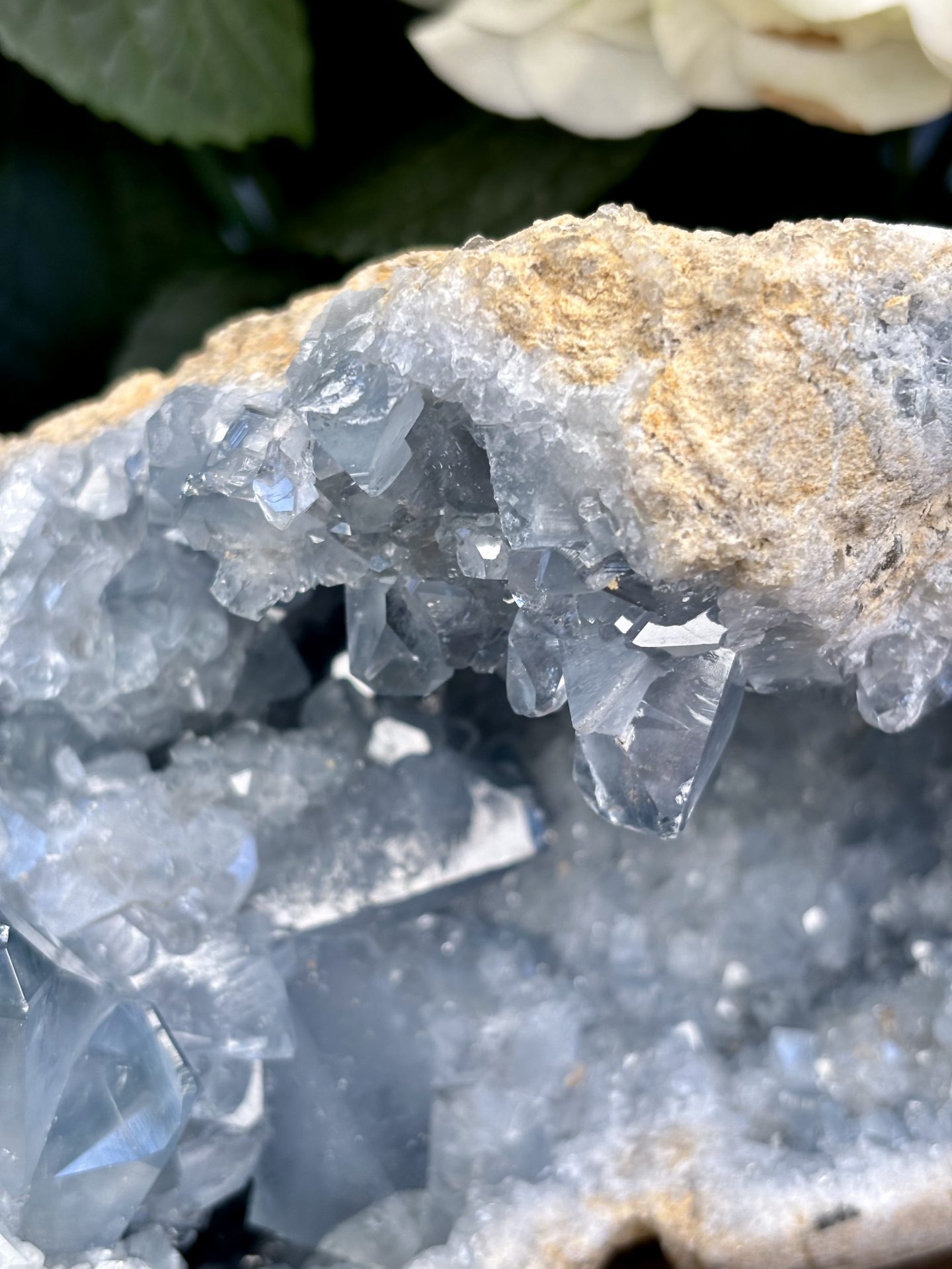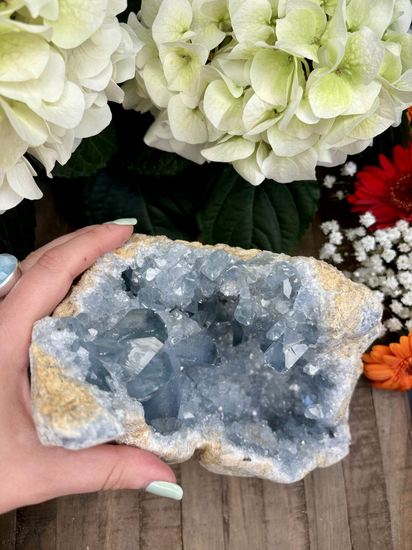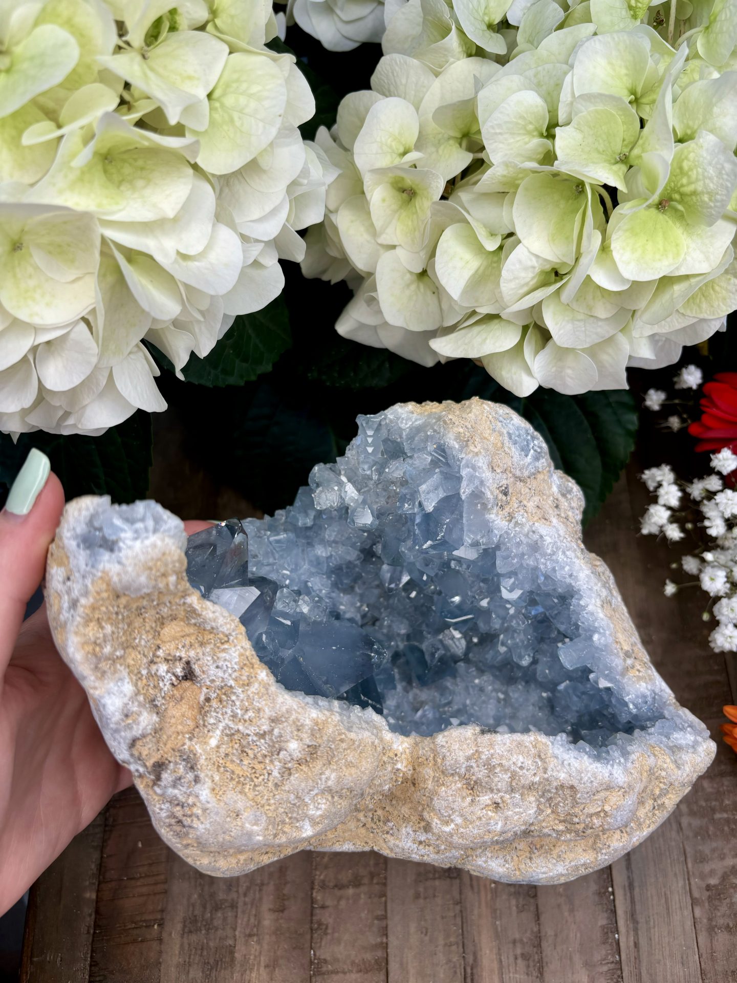 ⚠️ La Célestine est un minéral friable (dureté 3 sur l’échelle de Mohs), il est donc possible de trouver de petits morceaux à la réception des géodes. La Célestine comporte naturellement des imperfections (Trous, cavités, fissures) qu’il est possible de retrouver sur les géodes.