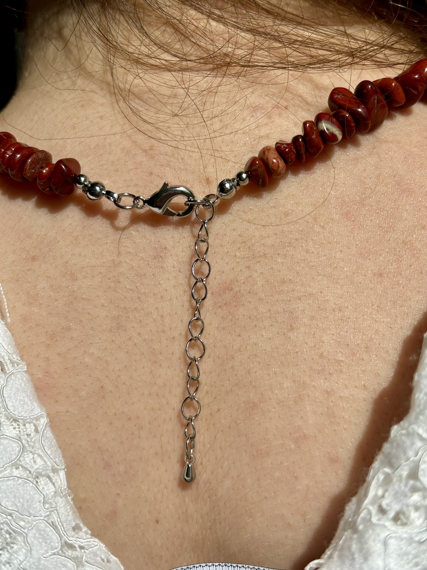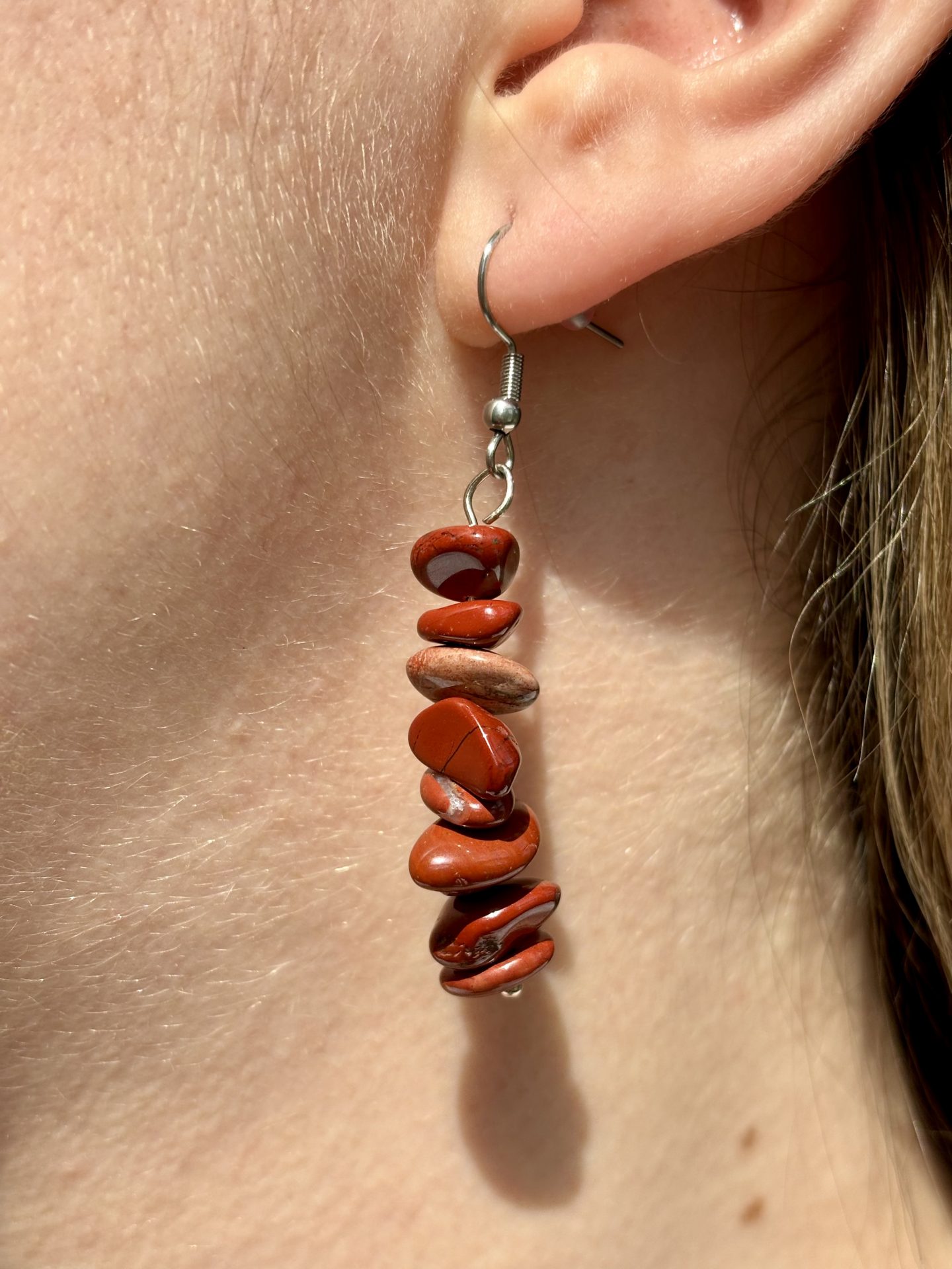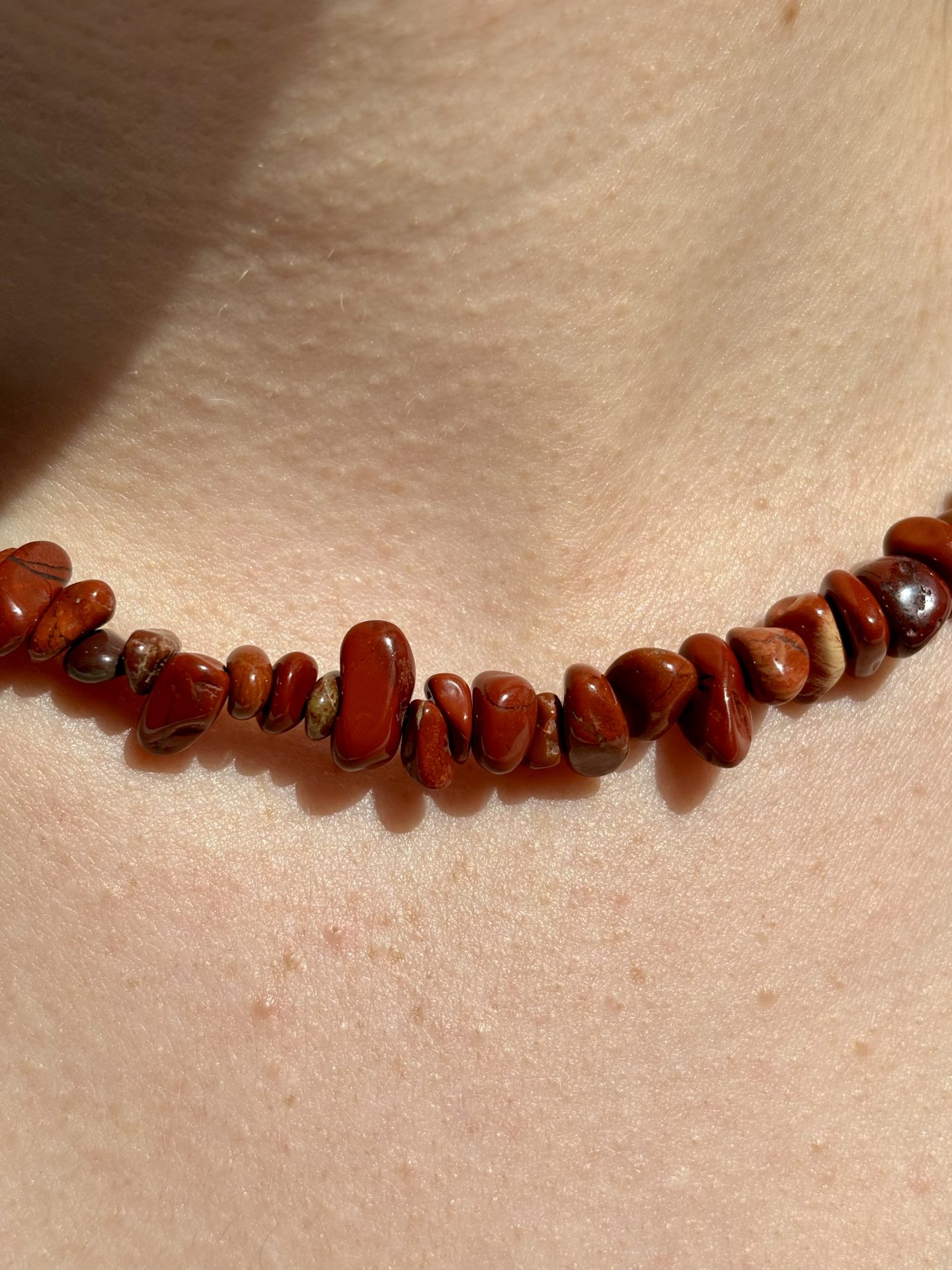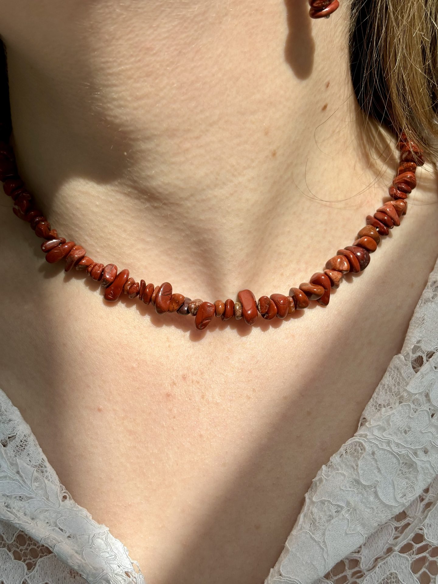 La Parure « Volonté » en Jaspe Rouge fait partie de notre Collection de bijoux Galets Uniques, fabriqués de pierres naturelles véritables.