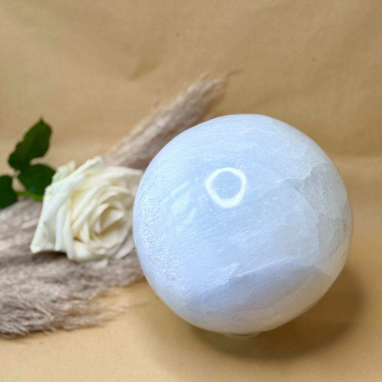 Sphère de Sélénite vendue à l’unité, numérotée et d’excellente qualité (A+). Livrée avec son support.